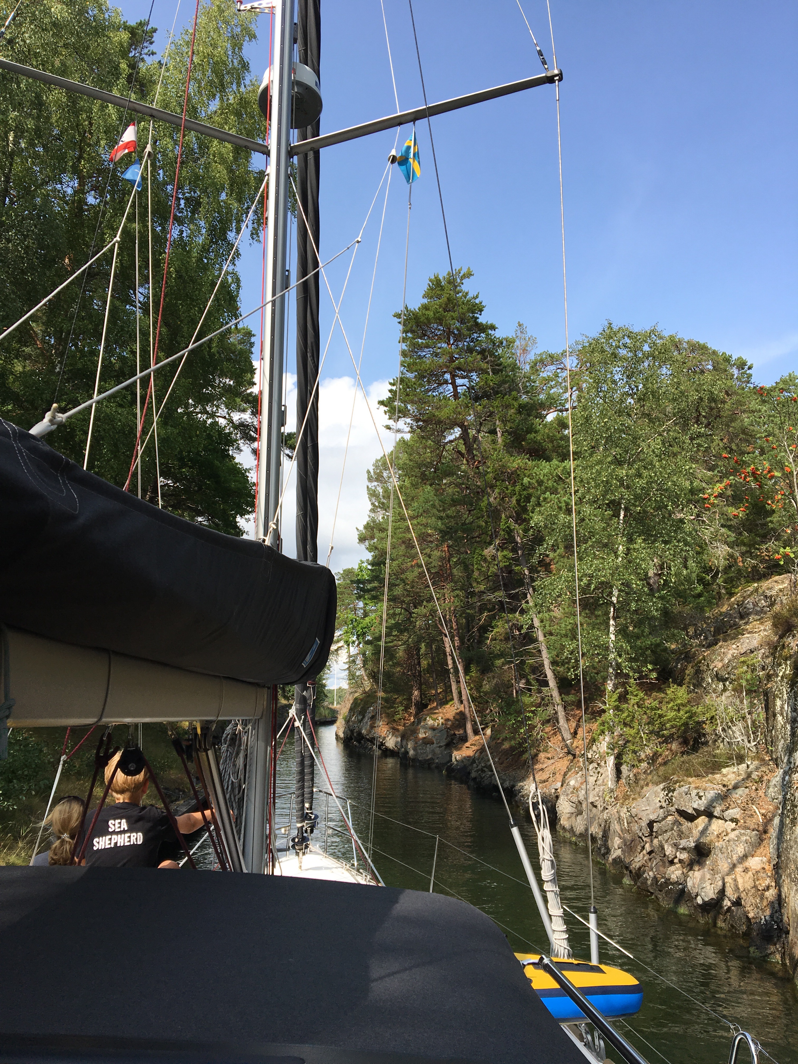 Anfangs sind wir noch etwas gesegelt, aber als der Wind an einer Engstelle dann wieder genau von vorne kam haben wir die Fock ein- und unter Motor das Groß dichtgeholt. Drei Segelschiffe kommen entgegen, von denen wir uns frei halten. Das erste fährt backbord voraus unter schwedischer Flagge unter Membran-Groß… alles entspannt! Nicht weit vor uns liegen die Steine, die wir an Steuerbord lassen müssen… aber das passt. Doch dann setzt sich in dem modisch kahl geschorenen Kopf, wahrscheinlich ziemlich dicht hinter der coolen Sonnenbrille des anderen Steuermannes ein Gedanke durch: „Halse nach Backbord“. In knapp vier Bootslängen Entfernung setzt das andere Boot also direkten Kollisionskurs auf uns. Und auch in dieser neuen Situation als Segler uns gegenüber natürlich weiterhin Kurshalter, ist genau das seine Strategie: stur geradeaus. Nach unserem Manöver des letzten Augenblicks hart Steuerbord haben wir dann überholen lassen… die zwei (mutmaßlichen) Schweden grußlos mit starren Blick voraus. Auch ich habe uns allen die freundliche Nachfrage nach dem tieferen Sinn dieses innovativen Manövers erspart und wir sind wieder auf Kurs Richtung Ringsön gegangen.