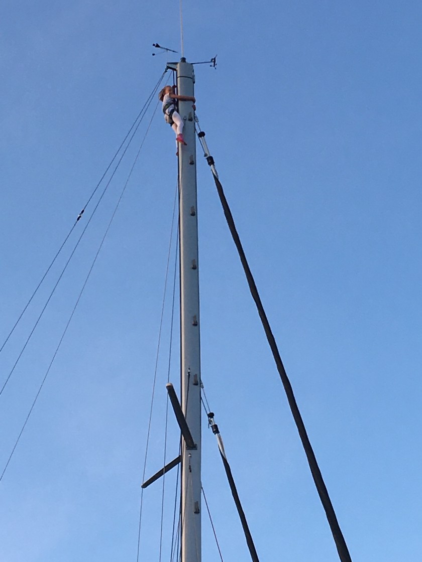 Das habe ich mit 5 Jahren nicht gemacht! Masthöhe knapp 20m über Wasserlinie. Und auch der Große (9 Jahre) war schon ein halbes Dutzend mal im Top!