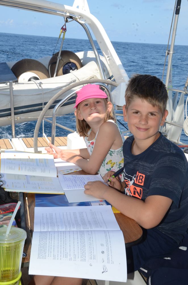Unser erstes Etmal (also die mit einem Boot in eine Tag zurückgelegte Strecke) betrug 147sm. Wenn das so weiter geht, kommen wir morgen Abend in A Coruña an. Während der Skipper nach durchwachter Nacht bis 13 Uhr schlafen durfte, haben La Skipper und die Kinder sich mit der Schule beschäftigt. Ja, richtig gelesen… an Bord ist Ferienende, der Müßiggang der Kinder ist vorüber. Schließlich machen wir hier nicht drei Jahre Urlaub, sondern ändern für drei Jahre unsere Art zu leben. Und das bedeutet ausdrücklich nicht, frei von allen Verpflichtungen zu sein!