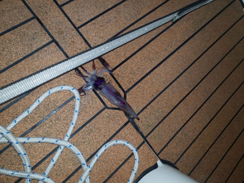 Skipper: Unterwegs haben wir auch erstmals unsere große Angel benutzt, allerdings noch ohne Erfolg. Wir waren zwar schnell genug unter Segeln unterwegs, allerdings passte der Köder wohl nicht wirklich. Auf den Kanaren werden wir mal nach den uns empfohlenen Hochseewobblern Ausschau halten. Damit sollt es dann auf dem weiteren Weg zu den Cap Verden hoffentlich mal klappen. Trotzdem hatten wir nicht nur den einen, oben beschriebenen Tintenfisch gefangen. Unglaublich, aber wahr: in der darauffolgenden Nacht hat tatsächlich noch ein zweiter Tintenfisch den Weg an Bord gefunden… dieses mal auf das seitliche Laufdeck!