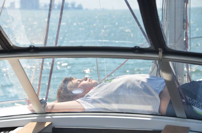 Maila: Es war heute ein schöner, sonniger Tag. Die Welle kam von schräg hinten und es hat geschaukelt. Deswegen mussten wir uns auch erst daran gewöhnen an das Geschaukel und konnten kaum gut schlafen. Der zweite Tag war eigentlich schon ein bisschen besser als der erste und uns war nicht übel. Dann konnten wir auch besser schlafen, aber nicht am besten. Papa hat natürlich die ganze Zeit Nachtwache gehalten und Mama hat so um sechs mit ihm getauscht. In der zweiten Nacht wurde Papa plötzlich angesprungen.