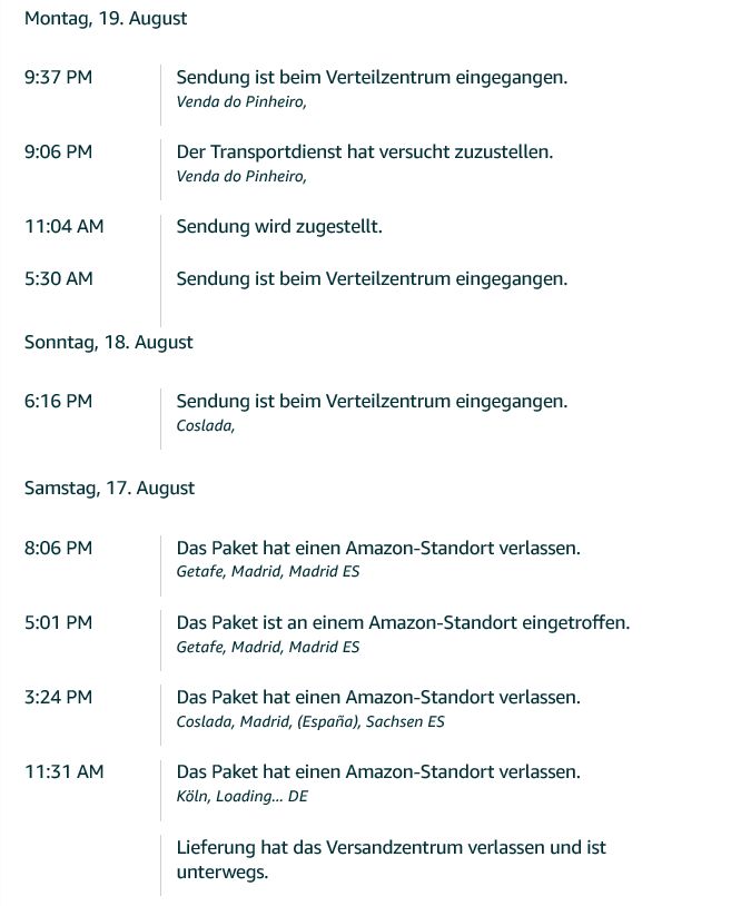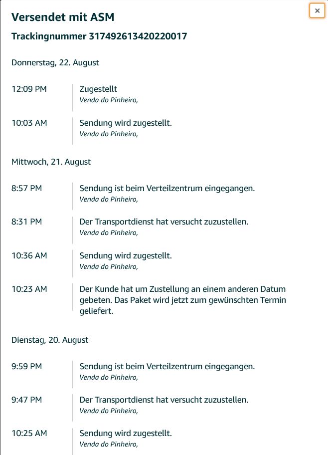 Das zweite Paket wurde erst ganze fünf Tage nach Bestellung überhaupt versendet… das nenne ich mal „Express“. Egal, Hauptsache es kommt an. Die GLS-Gruppe durfte zeigen, dass sie es besser können als die Konkurrenz. Konnten sie aber nicht. Nach zwei Tagen „in Zustellung“ und „konnte nicht zugestellt werden“ rief ich Amazon an. Leider keine Hilfe. Die nette Dame habe ein Formular ausgefüllt, in den nächsten Tagen sollte sich der Dienstleister bei mir melden. Tat er aber nicht. Und die Sendungsverfolgung auf dessen Webseite funktionierte auch nicht. Über die von Amazon erhaltene spanische Hotline hatte ich dann irgendwann den portugiesischen Telefonservice am Handy. Desculpe, fala inglês? Zum Glück ja! Und dieses Glück kannte kaum Grenzen, als ich dann das reichlich ramponierte aber augenscheinlich noch leidlich verschlossene zweite Paket im Shop abholen konnte… ganze elf Tage nach Express-Bestellung.