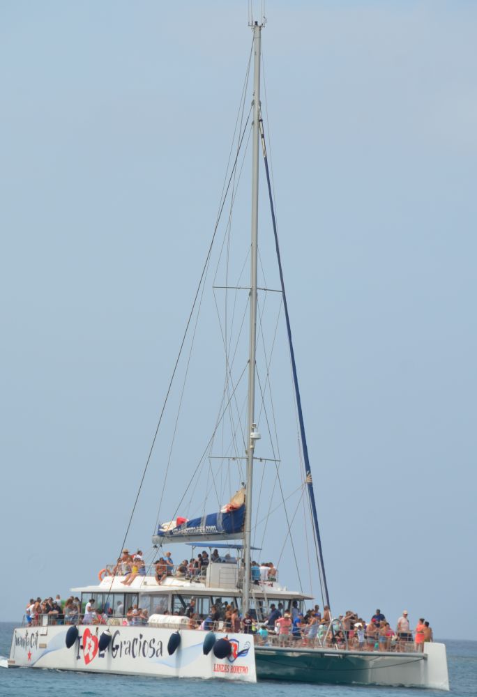 Doch dann kam das Imperium des Tourismus mit voller Macht über uns… besser gesagt in die Bucht. Vorboten waren zwei kleine Boote, die Wasserspielzeug und Kajaks brachten. Und dann bogen sie Sternenzerstörern gleich um die Ecke: zwei riesige Katamarane. Brechend voll mit jeweils weit über 50 (Sic!) Gästen, die leicht bekleidet bei wummernder Musik dem Badestopp in dieser bis dato idyllischen Bucht entgegenfieberten, pflügten sie unbeeindruckt durch die kleine Rebellenflotte der Segler zu Ihren Bojen. Schwärmen von Tie-Jägern gleich ergossen sich die Urlaubswütigen ins Wasser und an den Strand. Doch so schnell wie er gekommen war, verschwand der Spuk nach wenigen Stunden auch wieder und es war wieder so ruhig wie in den Weiten von Tatooine… halt nur mit Wasser ;-)