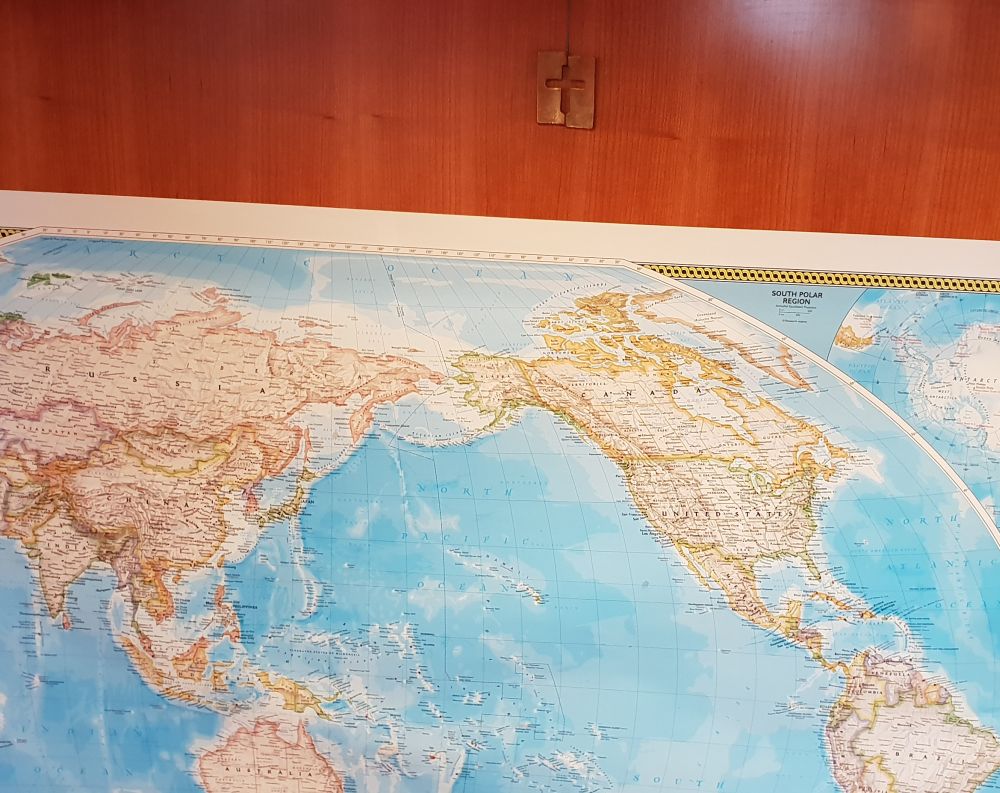 Nach der Messe habe ich dann noch auf den Pater gewartet. Nach dem Umziehen in der Sakristei ging er (den augenscheinlich nicht vor Ort verbleibenden Messkelch in der Hand) durch die Kirche… im regen Austausch mit der Gemeinde. Dabei nahmen – für mich völlig ungewohnt – immer wieder Menschen seine Hand und führten sie an ihre Stirn… für einen kleinen persönlichen Segen. Ich hatte auch die Gelegenheit für ein kurzes Gespräch und er entsprach gerne meiner Bitte, unser kleines Kreuz zu segnen. So hängt es nun über der Weltkarte im Salon und wacht über die Samai und ihre Crew…
