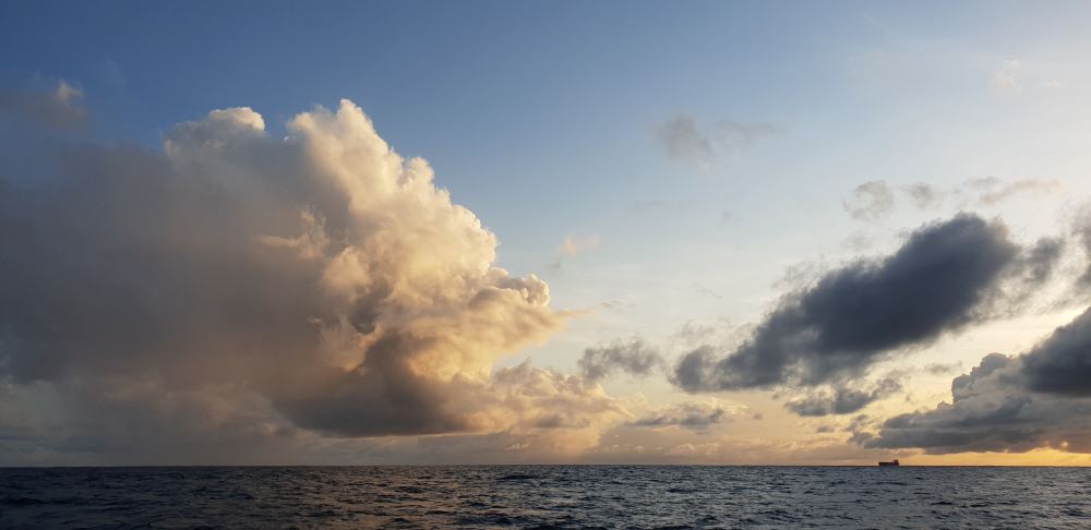 Wir hatten insgesamt also eine recht breite Schwachwindzone (Doldrums) erwischt. Und es war immer noch trocken an Bord der Samai. Allerdings bauten sich rundherum immer größere und imposantere Wolkenberge (… ach was, Wolkengebirge!) auf. Immer häufiger sahen wir Regenzellen, die Ihre Last sintflutartig ins Meer ergossen. Nur wir waren unsere Sandschicht immer noch nicht losgeworden.
