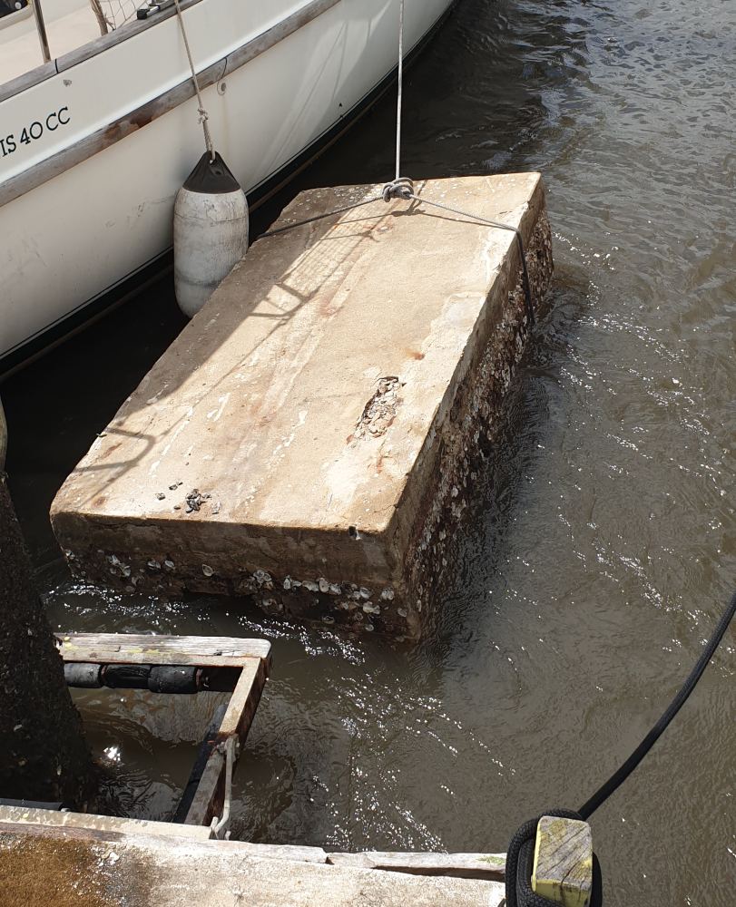 Oder auf Portugiesisch… da ist es manchmal das Beste, jemanden einfach mit sich zu nehmen und den im wahrsten Sinne des Wortes „Stein des Anstoßes“ zu zeigen. Es war gegen halb fünf morgens, als wir von einem komischen Geräusch am Rumpf geweckt unseren Augen kaum trauten, die einen großen, schwimmenden(!) Stein von der Strömung zwischen uns und dem Nachbarboot eingeklemmt sahen. Da würde am benachbarten Schwimmsteg nun wohl ein Teil fehlen. In der Frühe nur provisorisch in die große Lücke auf der anderen Seite gezogen erfolgte der Abtransport dann gegen Mittag bei gekipptem Strom.