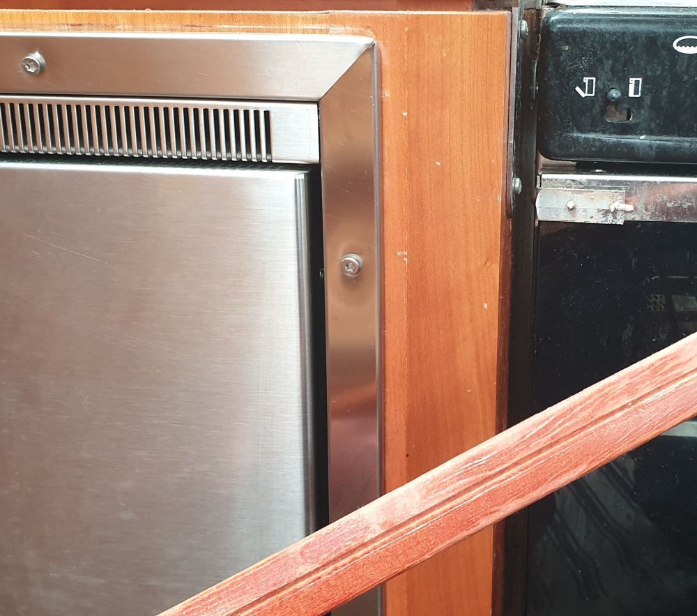 Weniger lustig war für den in der Pantry stehenden Skipper, als bei der Schräglage plötzlich der Kühlschrank rauskam. Wir fanden es schon immer ambitioniert, dass dieser von nur vier kleinen Schrauben an Ort und Stelle gehalten wird, hatten aber nie ein Problem damit. Vor der Abfahrt musste er dann aber für die Installation des Wassermachers rausgenommen werden… und da haben die Schraublöcher im Holz anscheinend etwas gelitten. Seitdem kam immer mal wieder eine Schraube etwas raus und wurde immer mal wieder reingeschraubt. Nun der ganze Kühlschrank! Im Grunde war es aber Glück, dass ich daneben stand, ihn aufhalten und somit eine Karambolage mit der Niedergangstreppe vermeiden konnte. Ein weiteres Kapitel zum Thema „Reparieren und Improvisieren auf See“. Ich hatte jetzt nicht nur vier längere Schrauben rausgeholt um die Dicke das dahinter liegenden Holzen voll auszunutzen, sondern auch gleich noch zwei weitere Löcher in den Metallrahmen gebohrt, so dass nun insgesamt sechs Schrauben Dienst verrichten. Ok, die untere Tür hakt aktuell noch etwas, aber das schauen wir uns dann in der Ruhe eines Hafens oder Ankerplatzes genauer an. Dort kann ich mich dann auch gleich um den Griff der Ofentür kümmern. Ja, er war schon vorher etwas locker. Trotzdem kam sein Entschluss, ohne weitere Fremdeinwirkung als dem Seegang einfach mal so durch das Boot zu fliegen doch eher überraschend. Hier hätten die vier Schrauben eigentlich ausreichen sollen.