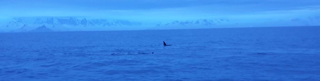 Insgesamt waren es 3-4 Schwertwale, die einige Minuten mit unserem Boot schwammen, immer mal wieder auftauchten und auch der Sarah voraus einen Besuch abstatteten (… dem derzeit Wachhabenden wurde die Geschichte bis zu unserer Bestätigung nicht geglaubt!). Unsere Mädels waren zu diesem Zeitpunkt natürlich nicht erweckbar, aber Samuel hatte ich aus dem Bett bekommen, so dass auch er (ob der Eile selbstredend viel zu leicht bekleidet) diese auch in der Antarktis eher seltenen Begleiter beobachten konnte.