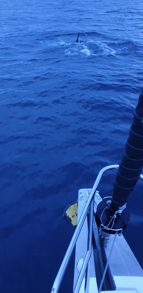 Um 4:30 Uhr war ich nur kurz unter Deck, wurde beim Hochkommen ins Cockpit dann aber auf unglaubliche Weise empfangen. Direkt am Steuerbordheck (also keinen Meter daneben!) tauchte ein hell-dunkler Walrücken mit langer Finne auf. Orca!