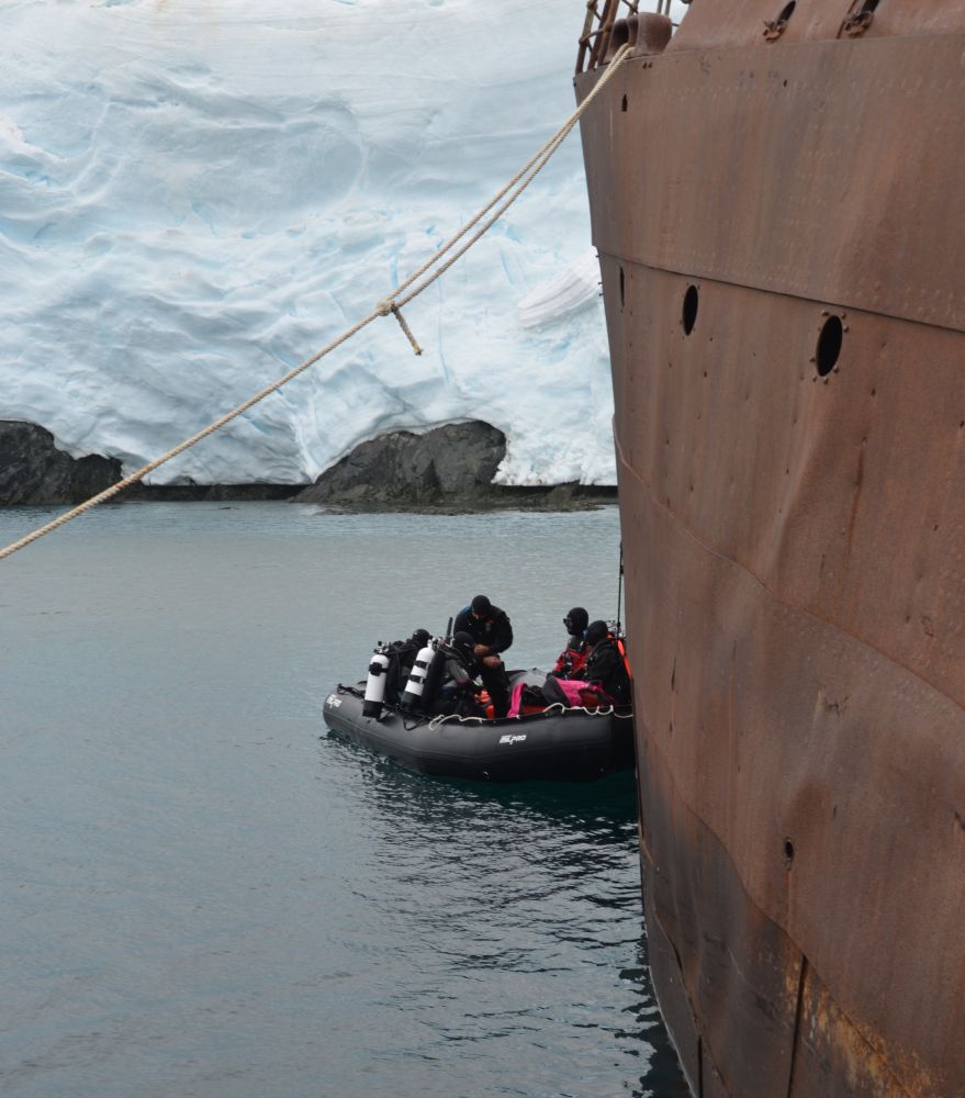 Kaum am Wrack angelegt, wir waren noch dabei die Leinen zu sortieren, lag dann ein weiteres Zodiac hinter uns und bat um einen Plausch. Von Landsmann zu Landsmann. Ob wir denn wirklich am Wrack liegen wollen. Natürlich frage er das nur zu unserer Sicherheit, der Status der Governoren sei nicht bekannt, und das sei damit doch sehr gefährlich für uns. Viel sicherer ist es doch gegenüber am Felsen festzumachen. Also dort, wo jederzeit Eis oder Stein von oben auf unser Schiff fallen kann. Da habe ich dann doch ein etwas anderes Verständnis von Sicherheit. Zumal in allen einschlägigen Segelführern der Liegeplatz längsseits am Wrack empfohlen wird. Wir blieben natürlich wo wir waren.
