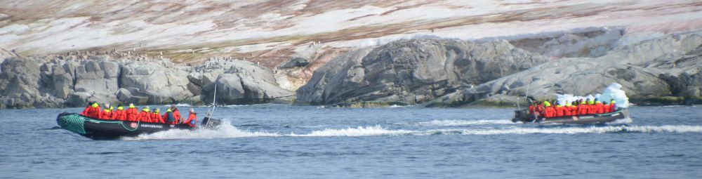 Wohlgemerkt können nacheinander durchaus alle an Land kommen und vollbeladene Beiboote auf dem Wasser zählen ja auch nicht mit. Entsprechend geschäftig geht es zu. Das ankommende Schiff ist noch in Fahrt, da gehen schon die Zodiacs zu Wasser und düsen kurz danach mit jeweils 10 Passagieren und einem Guide umher. Zweifelsfrei immer im Einklang mit den selbst gegeben Regeln. Darin findet sich natürlich nichts zum Thema „Unter-Wasser-Lärm“.
