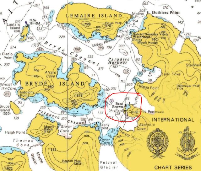 In Paradise Harbour gibt es gleich zwei Stationen. Im Norden betreibt Chile die (wohlgemerkt militärisch besetzte) Gonzales-Videla-Station. Die hatten wir zunächst nur passiert. Weiter im Süden, aber noch gut in Sichtweite, findet sich die lange verlassene, nun aber wieder besetzte Almirante-Brown-Station von Argentinien. Und davon südlich um die Ecke gibt es eine kleine, nahezu kreisrunde Bucht, die wegen Ihrer flachen Einfahrt auch gut vor Eis geschützt sein soll. Man muss halt nur die Durchfahrt finden… rechts halten soll helfen.