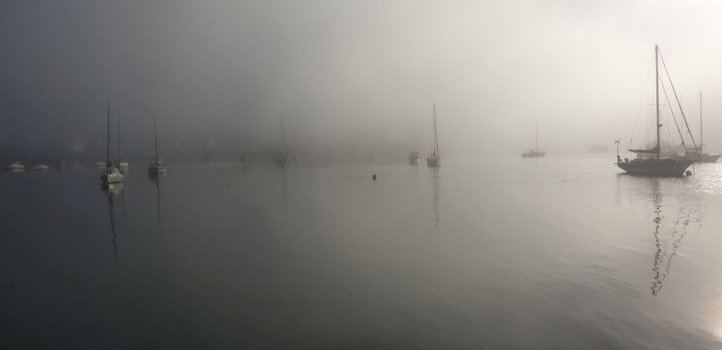 Nicht nur in Deutschland verbindet man mit dem Herbst ein zumindest für Segler auf dem Wasser eher unangenehmes Wetterphänomen: Nebel. Dieser ist hier gar nicht mal so häufig, doch vor ein paar Tagen war er tatsächlich mal angesagt. Und dann kam er auch mit Ansage. Vom Beagle-Kanal her war die Nebelbank gut auf Ihrem Weg zu beobachten. Immer näher kam die große Bodenwolke. Und dann war die vorher noch vom blauen Himmel strahlende Sonne mit einem Mal verschwunden…
