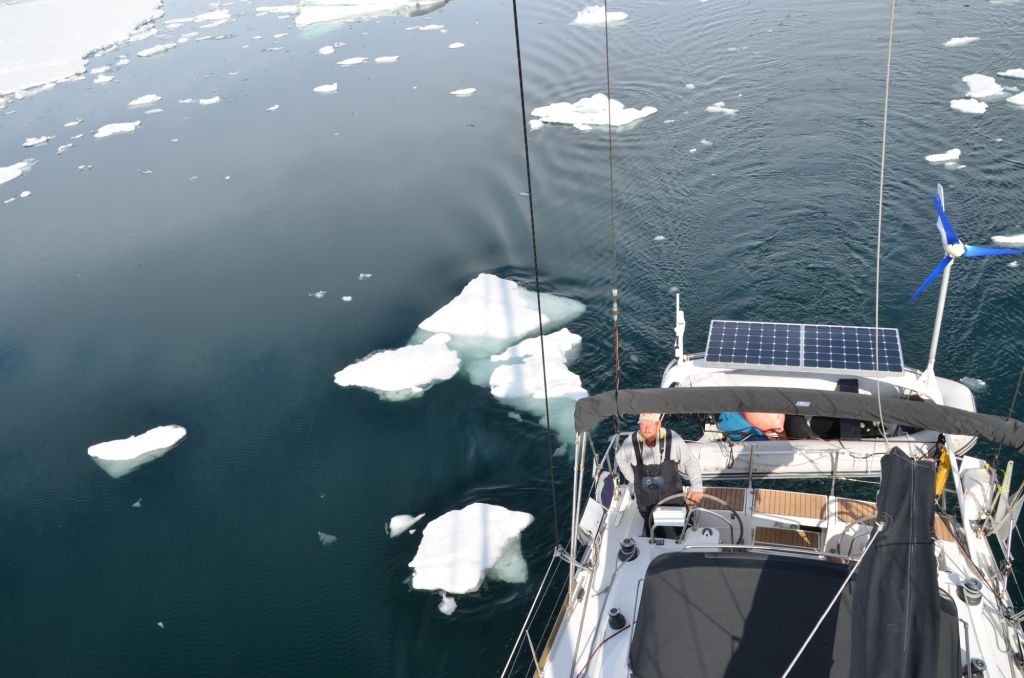 Eis verschiedener Größe sorgte für Slalomfahrt auf dem Wasser. Doch dann lag da so ein großer Eisberg direkt voraus. Es stellte sich die Frage, ob wir daran besser rechts oder links vorbei kommen. Die einfache Antwort lautete: Gar nicht! Dahinter war statt Wasser eine geschlossene, weiße, nur mit einigen Robben gesprenkelte Eisdecke zu sehen.