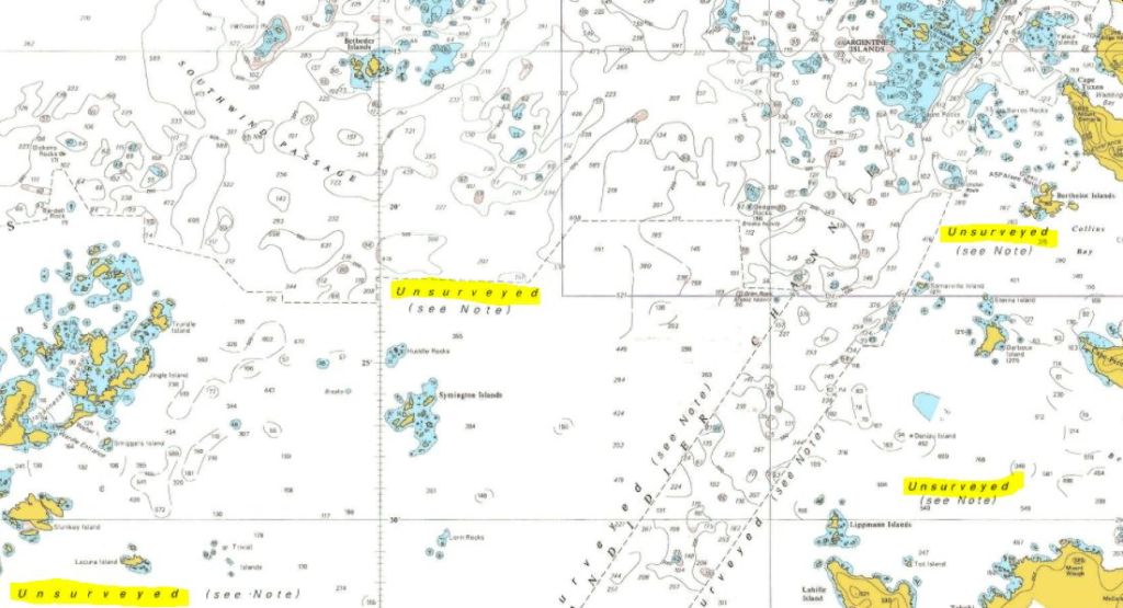 Ebenso prickelnd sind die vielen weißen Flächen, in denen wahlweise „Unsurveyed (see notes)“ oder „Depths (see notes)“ steht. In diesen Notes finden sich dann Hinweise wie „Uncharted dangers may exist“ oder „Owing to the age and quality of the source information, some detail on this chart may not be positioned accurately“ und natürlich „Mariners are advised to navigate with caution“.