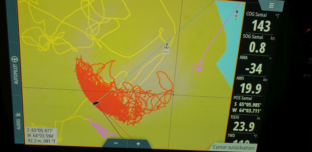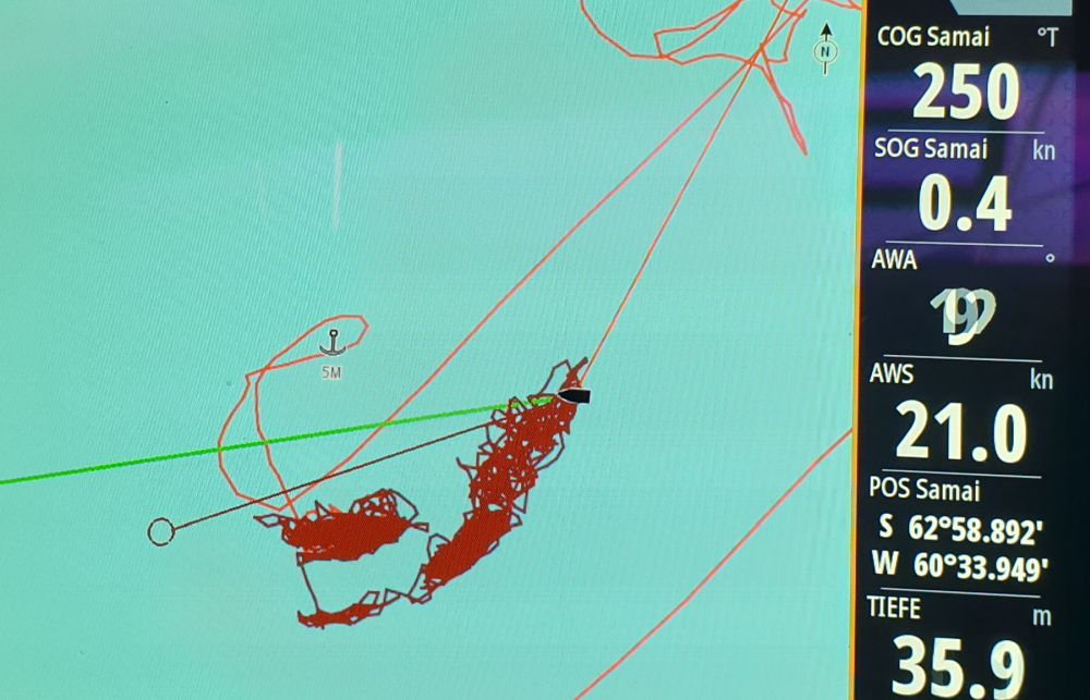 Unseren bisher persönlichen Rekord stellten wir dann bei den Yalour Islands auf. Ich hatte den Ankerplatz der Sarah markiert und war dann ob der dort herrschenden Wassertiefe doch etwas überrascht. Aber nun gut, es schien sich um eine größere, gleichmäßige Ebene zu handeln. Also ging der Anker runter auf sage und schreibe 32m! Natürlich gingen die kompletten 100m Kette raus und was soll ich sagen… es hielt! Sogar so gut, dass wir alle entspannt die Pinguinkolonie besuchten ohne uns Sorgen um unsere Samai zu machen.