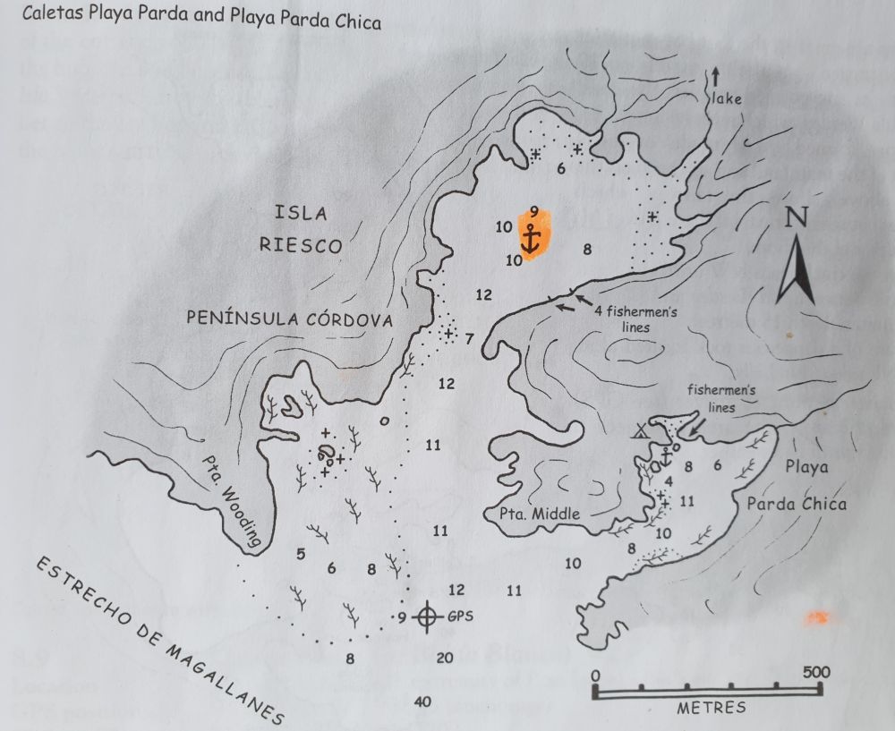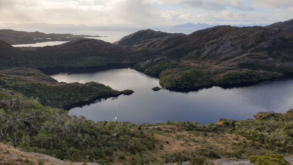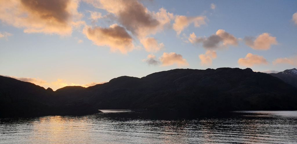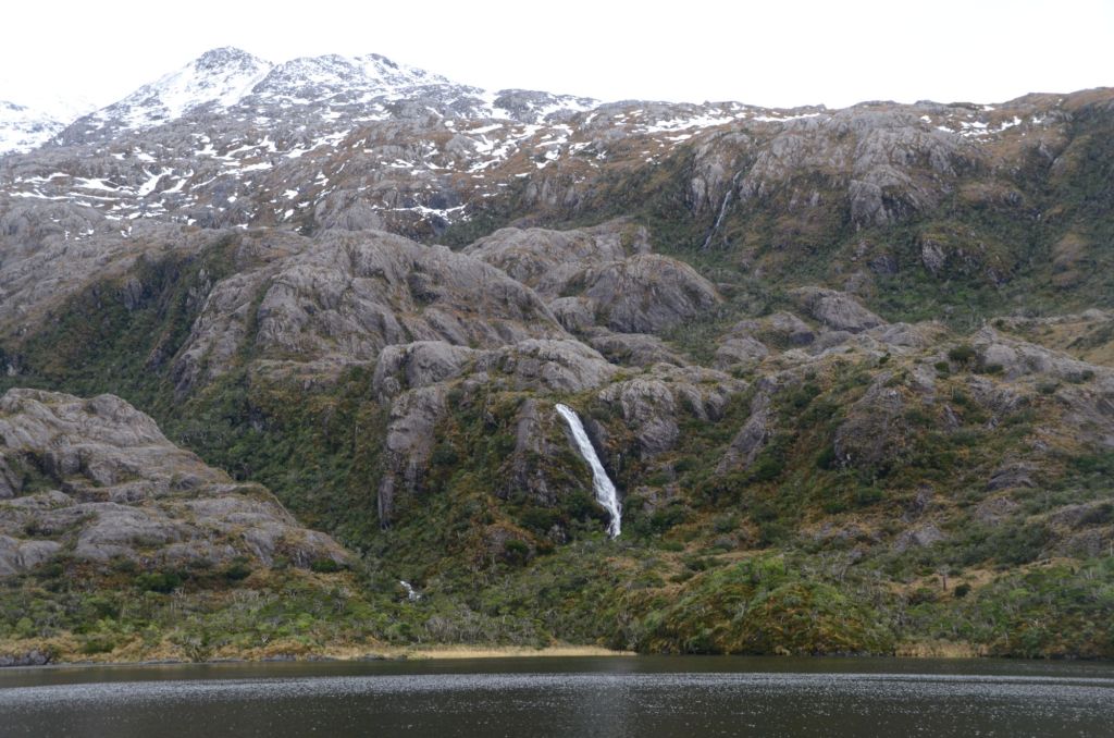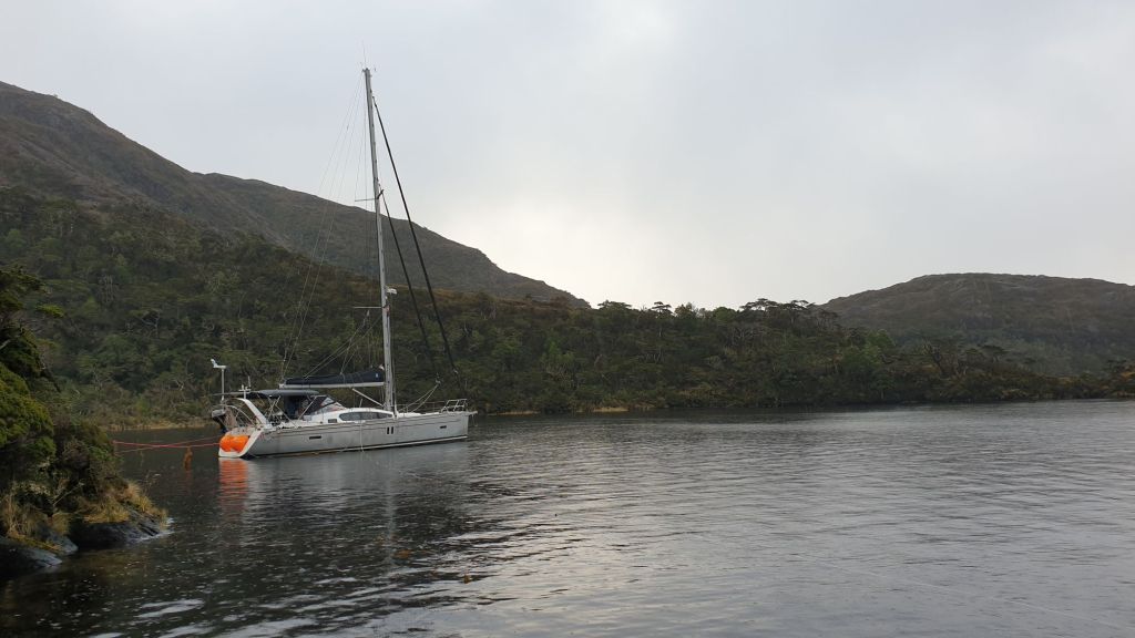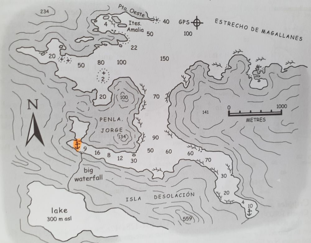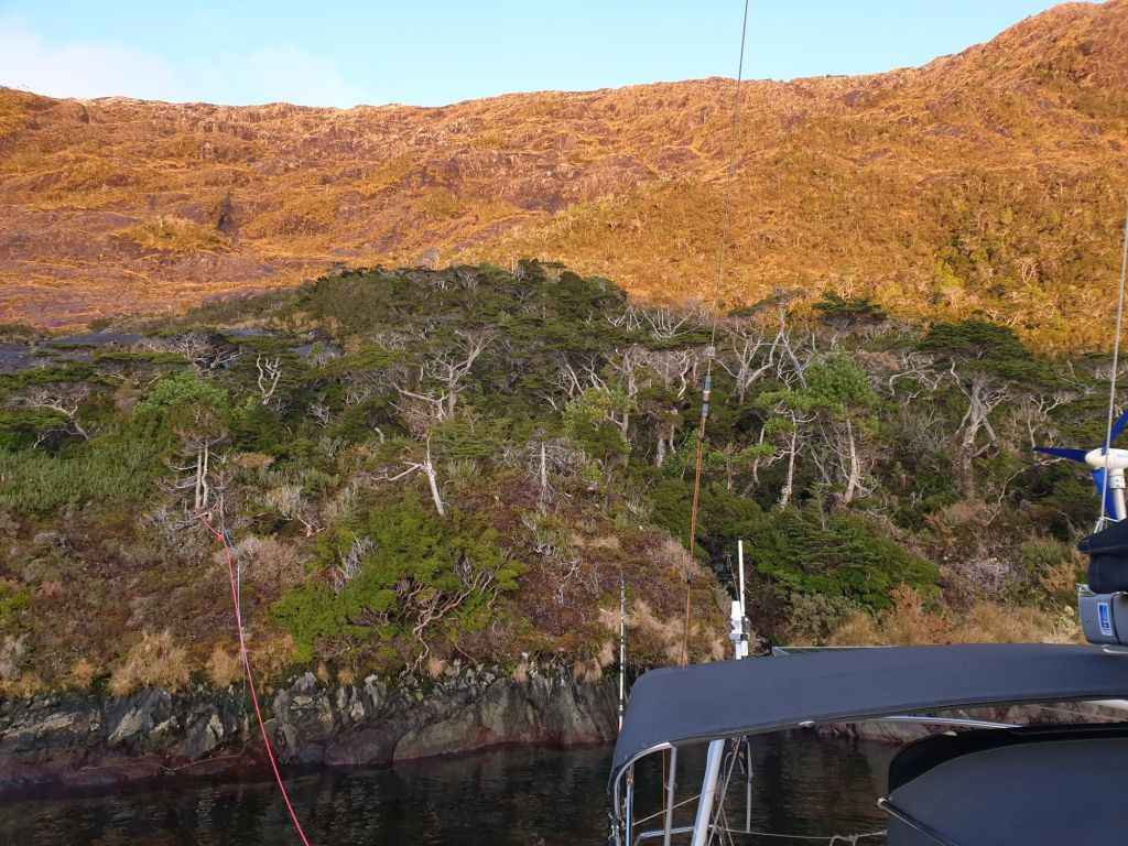 Bei Einfahrt zur Bahía Woodsworth zeigte sich wieder einmal, dass man den Seekarten hier nicht blind vertrauen darf. Wieder einmal fuhren wir über Land. Doch mit Ausblick und Radar stellte das kein Problem dar und pünktlich zum Sonnenuntergang gegen halb sechs fiel der Anker in einer malerischen Bucht direkt neben einem ca. 100m hohen Wasserfall.
