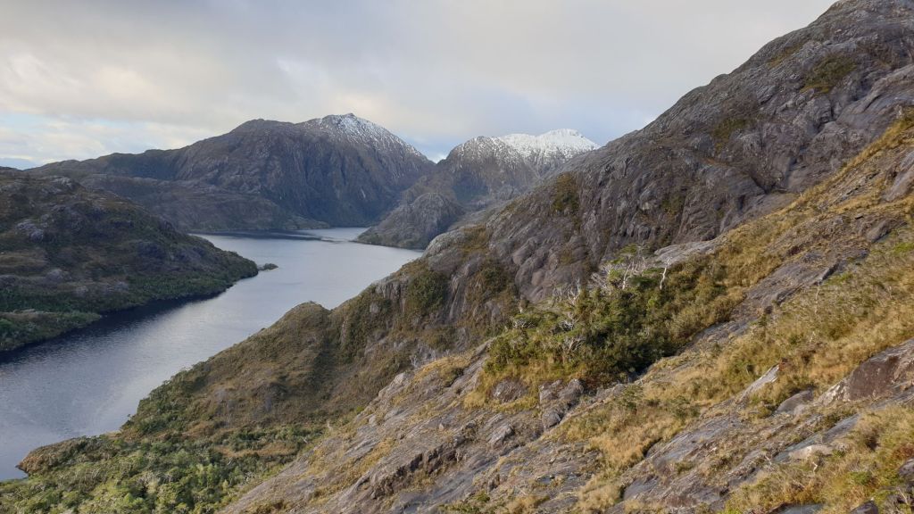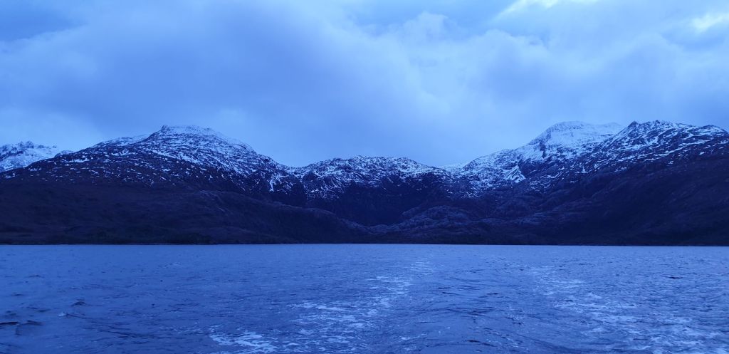 Kurz vor 10Uhr ging es also los. Der Wetterbericht versprach eine ruhige (Motor-)Fahrt mit leichtem Wind von hinten. Die „Böen“ sollten nur knapp über 10kn gehen. Doch offensichtlich hatte das Wetter seinen eigenen Bericht nicht gelesen. Kurz nach Einbiegen in die Magellanstraße blies es mit bis zu 30kn (7 Bft.). Wenigsten von schräg hinten. Das musste mit der Einbuchtung und den dahinter liegenden Bergen zu tun haben. Fallwinde sind hier ja keine Seltenheit. Folgerichtig lies der Wind auch bald wieder nach und wir motorten vor uns hin. Unten liefen Wassermacher und Brotbackautomat auf Hochtouren.