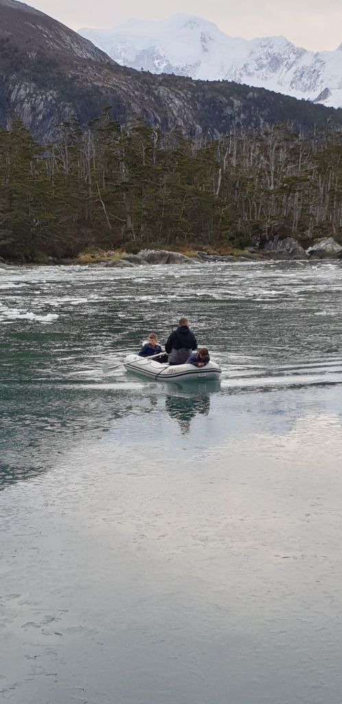 Als wir in die Ankerbucht einbogen, hörten wir auch wieder dieses vertraute, schabende Geräusch von Eis am Aluminiumrumpf. Doch hier war das noch absolut harmlos. Wir ankerten dicht am Ufer, zwei Landleinen hielten uns sicher am Platz und genossen erst einmal den atemberaubenden Ausblick…
