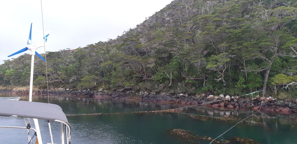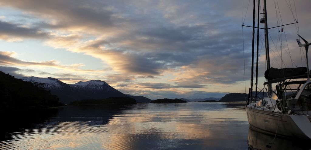 Die große Isla Gordon teilt den Beagle-Kanal an seinem westlichen Ende in die jeweils ca. 30sm langen Brazo Sudoeste und Brazo Noroeste. Letzterer ist für Segler die übliche Wahl. Er ist eingerahmt von hohen Bergen, dunkelgrünen Wäldern und schneebedeckten Gipfeln der Cordillera Darwin, welche hier über 2000m in den Himmel ragen. Meilenweit ins Landesinnere reichende Einschnitte erinnern an Norwegens Fjorde. Nur, dass hier noch Gletscher oft bis ans Wasser reichen. Seno Pia war ein solch beeindruckender Sund, bei dessen Ausfahrt wir dann auch gleich einen Vorgeschmack davon erhielten, was solche Küstenlinien für die lokalen Winde bedeuten können. Beim „Anker auf“ noch mäßig windig, blies es uns an der Mündung mit 7, in Böen 8 Windstärken (bis 38kn) von hinten hinaus. Sollten wir heute endlich mal wieder segeln können?