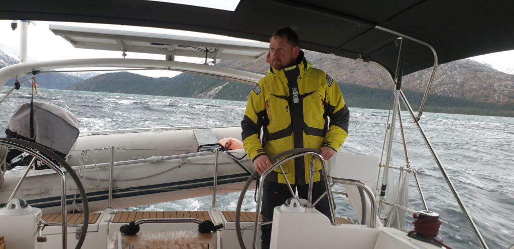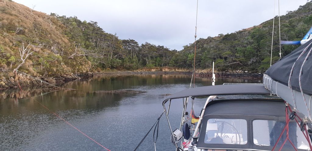 Nun ja… ich sage mal: „Es war wechselhaft.“ Der Wind pendelte ungelogen zwischen 4 und 34 Knoten und scheute sich auch nicht vor spontanen Drehern um 90°. Gerade noch ordentlich Lage geschoben, hing das Segel im nächsten Moment schon wieder schlaff runter. Bald zeigte sich steuerbord voraus die Öffnung des 11sm tiefen Seno Garibaldi an der Nordseite des Brazo Noroeste. Und das Wasser davor sah alles andere als ruhig aus. Es dauerte nicht lange und wir hatte „stabile“ 30-40kn von schräg vorne. La Skipper war natürlich hellauf begeistert und selbst der Skipper mit der Gesamtsituation dann doch etwas unglücklich. Ursprünglich wollten wir ja einen etwas längeren Schlag nördlich an der kleinen Isla Chair vorbei machen. Doch spätestens der Anblick vom Wind weiß in die Höhe getriebener Gischtwolken auf eben diesem Weg ließ uns zu Plan B wechseln. Die Isla bot schließlich auch eine bei diesen Bedingungen geschützte Bucht.