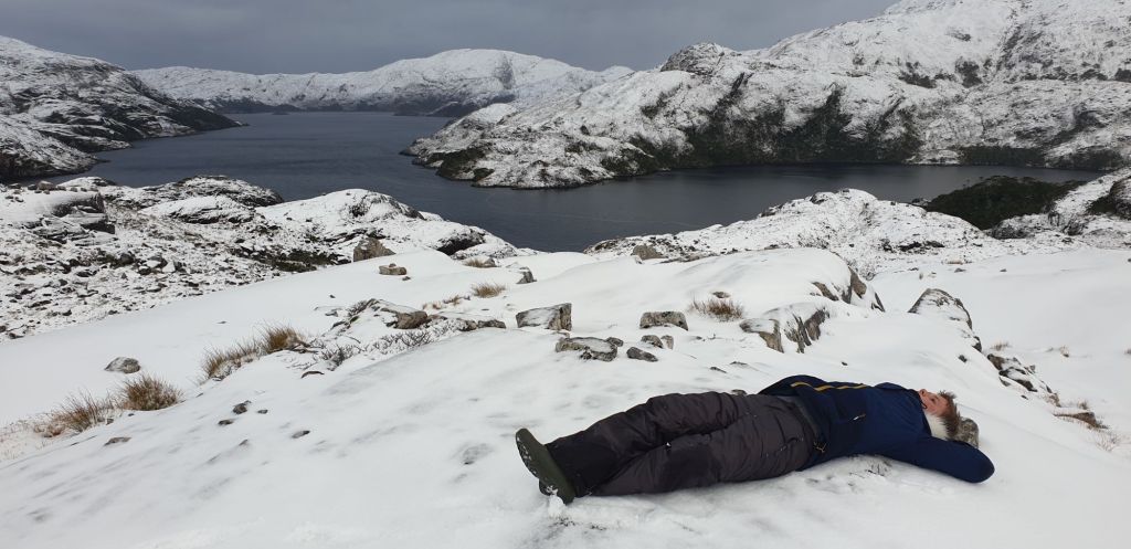 Später machte dann noch die ganze Familie einen Winterspaziergang im Juni. Durch frischen Schnee stapften wir erst in Richtung höher gelegenen See und schließlich auf einen der kleineren Gipfel der Umgebung.