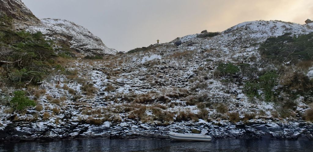 Die Caleta Brecknock gilt als eine der berühmtesten und spektakulärsten Ankerplätze in Feuerland. Zu Recht ist sie ein Pflichtbesuch für nahezu jede durchkommende Yacht. Umgeben von hohen, schneebedeckten Gipfeln und steilen Wänden lagen wir gut geschützt in einer kleinen Ausbuchtung. Mit wenigen Paddelzügen war das Dinghy am Ufer, die Kinder turnten gleich nach Ankunft den Hang hinauf und tollten munter umher.