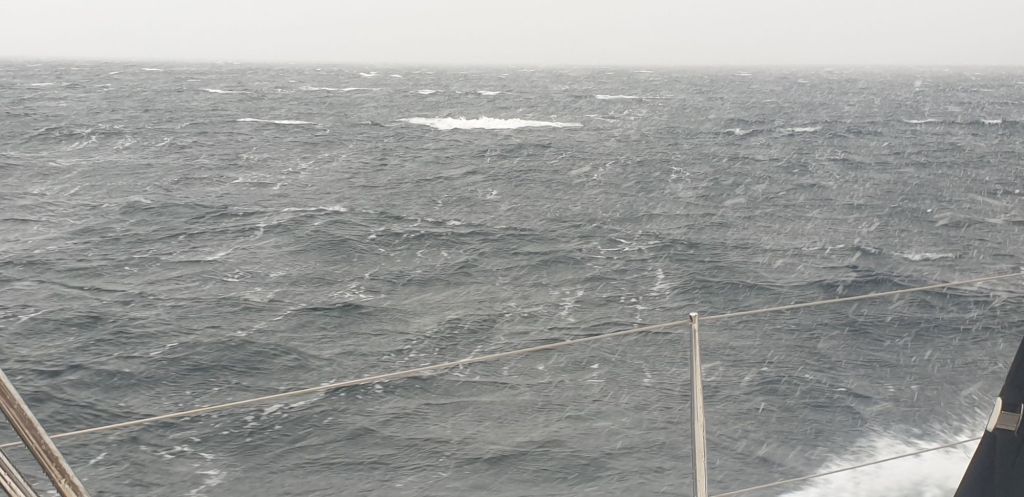 Die Böen in der Ankerbucht lösten sich nach Abfahrt in Wohlgefallen auf. Allerdings war der an Backbord gut zu erkennende Graupelschauer schon ein Vorbote für das, was da noch kommen sollte. Doch zunächst konnten wir tatsächlich mal wieder ein paar Meilen segeln. Unsere erste offene Pazifikpassage empfing uns zwar mit Schwell, aber eben auch schönen Seitenwind, mit dem hinter dem nächsten Berg allerdings schon wieder Schluss war.