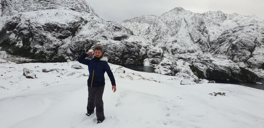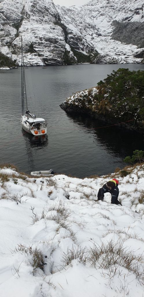Nach einer ruhigen Nacht empfing uns ein weißer Morgen. Nicht nur das Land, auch das ganze Boot war von einer Schicht Neuschnee überzogen. Das ließen sich Maila und Samuel nicht zweimal sagen. In Windeseile stand eine kleine Schneefamilie am Bug.