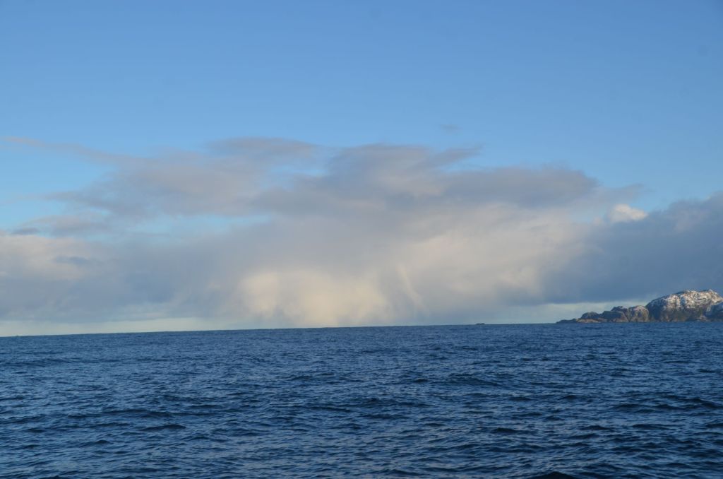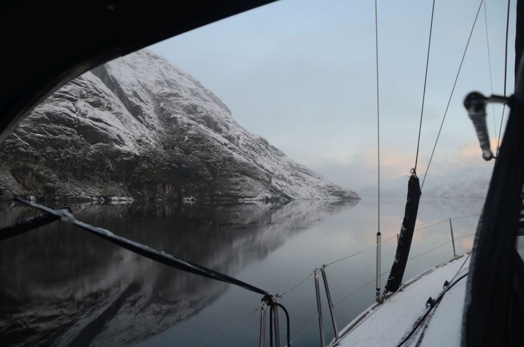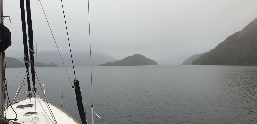 Der insgesamt ca. 40sm lange Canal Cockburn ist im Westen weit zum Pazifik offen. Gezeitenströme, Pazifikschwell und Wind können einem hier echt zusetzen. Doch wir hatten Glück, die Vorhersage verhieß eine entspannte Fahrt. Gleich nach Sonnenaufgang (also kurz nach 10 Uhr) machten wir die Leinen los und zogen den Anker hoch. Schnee fiel vom Himmel und ließen einen grauen Tag erwarten.