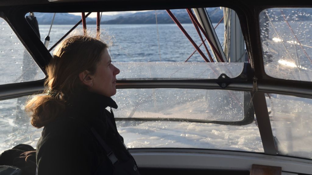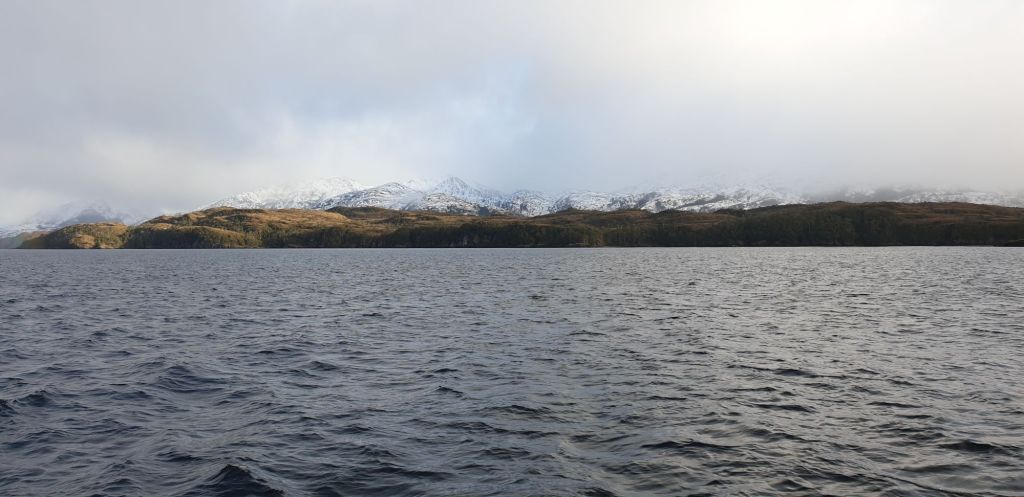 Gerade an den Engstellen mit teilweise gerade mal 4m Tiefe schob die Strömung kräftig, hin und wieder schaute ein Delfin aus dem Wasser, ein entgegenkommender Fischer tutete und winkte. Wir kamen so gut voran, dass wir beschlossen, das ursprünglich angedachte Ziel links liegen zu lassen und gleich noch eine Bucht weiter zu fahren… einmal quer über die Magellanstraße…