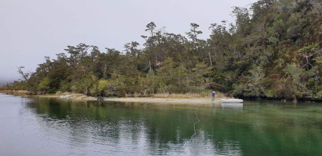Und schon wieder fuhren wir in einen selbst im uns empfangenden Regen absolut malerischen Fjord. In der Einfahrt ein kurzer Slalom zwischen mit Kelp markierten Steinen, vorbei an einem schönen Wasserfall und waren wir in der gut geschützten, hintersten Ecke.