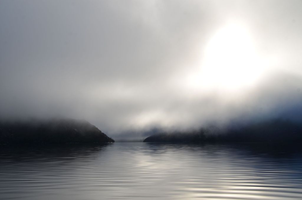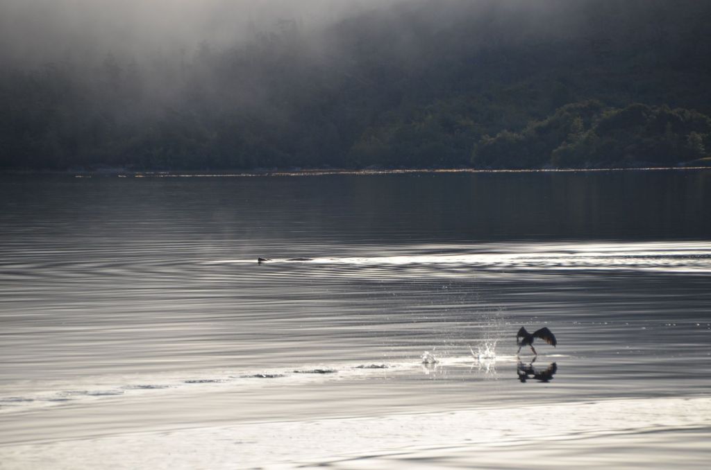 Der Morgen empfing uns wieder mit einem schönen Sonnenaufgang über den Bergen sowie einem dicht vernebelten Kanal (Paso del Indio). Die Windvorhersage bestätigte und stabilisierte sich, so dass wir uns (bedingt durch die Gezeiten erst) am Nachmittag auf den kleinen Hüpfer zu der nächsten, als Zwischenstopp ausgewählten Bucht machten.