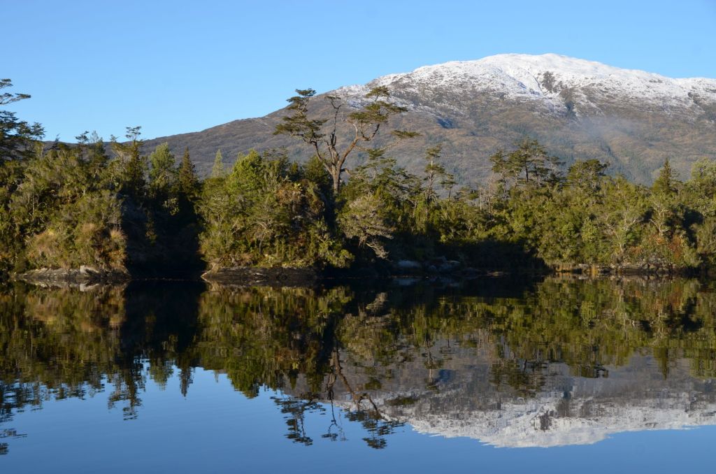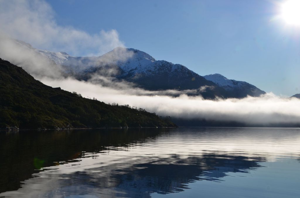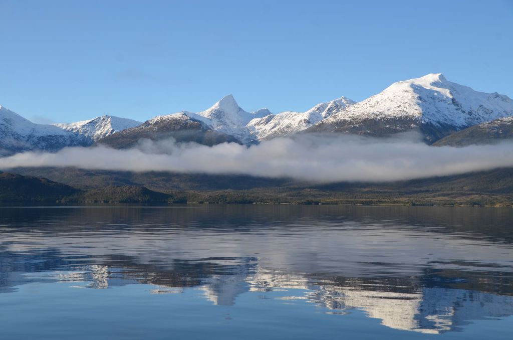 Und wieder wehte uns mehr Wind als angesagt entgegen. Eigentlich sollte es sich ja im Laufe des Tages aufklaren, doch davon war nichts zu merken. Eine dichte Wolkendecke lag kaum 100m über dem Wasser und war gekommen um zu bleiben. Ganz anders zeigte sich dagegen der von Osten kommende, fast 20sm tiefe Seno Pengüin. Dort lag die Wolkendecke auf dem Wasser, darüber blauer Himmel, Sonne und weiße Berge. Hier gab es einige von diesen „Senos“ genannten tiefen Einschnitten. Am Ende findet sich häufig ein Gletscher, deren Eis gerade in der kalten Jahreszeit gerne mal den Kanal erreicht. Davon blieben wir jedoch verschont.