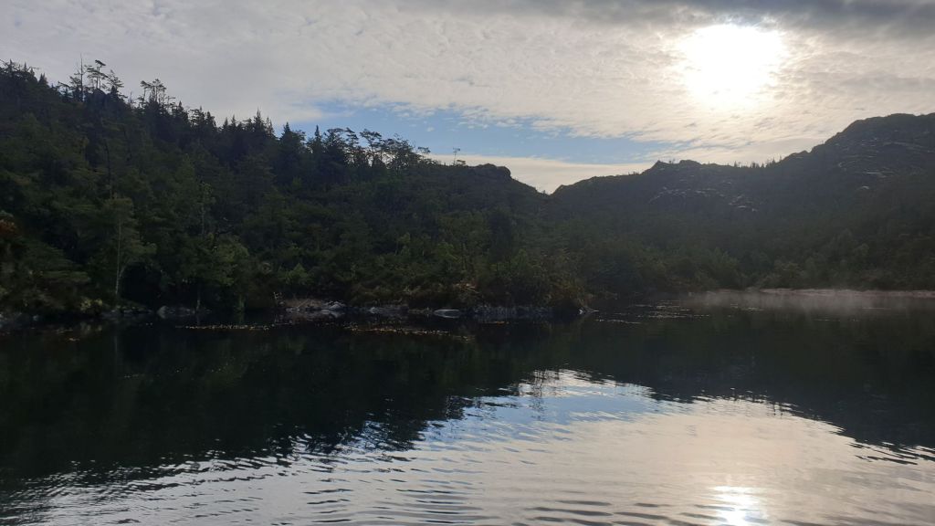 Doch ein Ende dieser täglichen Schläge war ja ohnehin in Sicht. Ab Dienstag (7. Juli) stellte die Vorhersage nördliche Winde in Aussicht und diese Winde kanalisieren sich hier zwischen den Bergen dann gerne mal zu ein paar Windstärken mehr. Wohlgemerkt gegenan. Für mehrere Tage sollte solch eine kleine Depression mit diesem Nordwind sowie Luftdruck unter 1000 mbar durchziehen und damit sicher für einen etwas längeren Zwischenstopp sorgen. Dazu kam noch der Umstand, dass sich die Gezeiten und damit die günstige Strömung immer mehr zu unseren Ungunsten verschob. Eine mehrtägige Pause zeichnete sich deutlich ab, doch vorher wollten wir noch etwas Strecke machen.