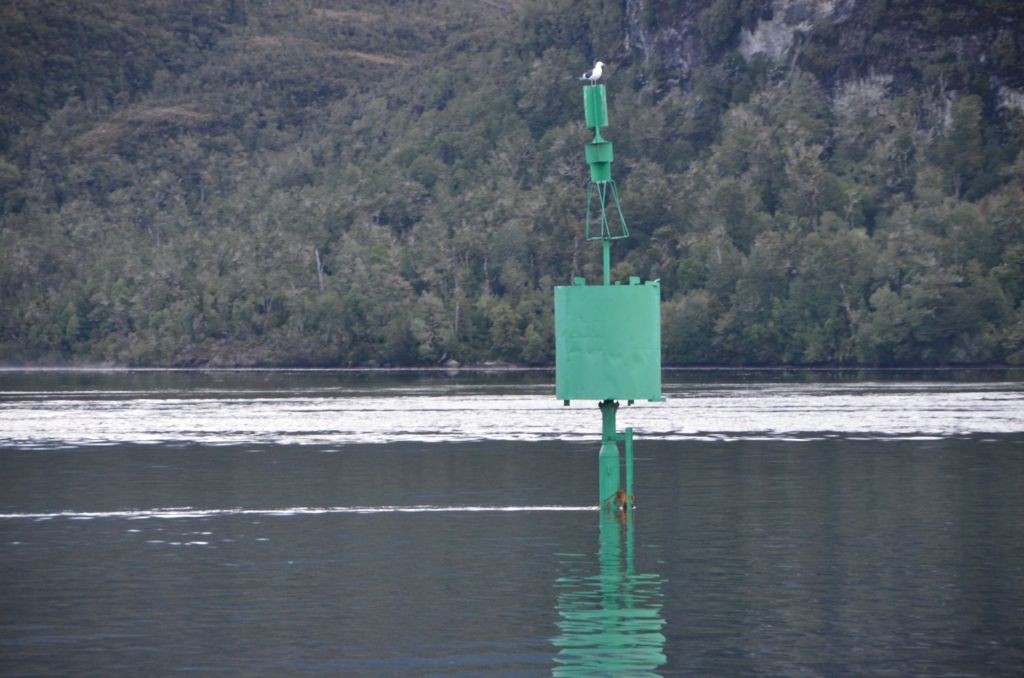 Wir hatten gerade Puerto Eden passiert und wollten eigentlich in der kleinen Caleta Lucas festmachen um dort gute Bedingungen für die Passage der Angostura Inglesa abzuwarten. Doch wir hatten Glück. Ein Blick auf den tief einstellig anzeigenden Windmesser sowie wichtiger noch die Ebbe anzeigende Gezeitentabelle brachte die Gewissheit, dass genau jetzt schon die bis auf Weiteres besten Bedingungen herrschten. Wir fuhren also direkt durch und bewunderten die Wunder der (Gezeiten-)Strömung. Vorher mit knapp 6kn über Grund gefahren machten wir in der Engstelle plötzlich 9kn, nur um nach Durchfahrt einer verwirbelten Stelle (mit entsprechendem Versatz) gleich wieder auf gut 6kn zu fallen. Vorbei an der Statue, welcher zufälliger Weise gerade von einem Fischer gehuldigt wurde, kamen wir problemlos durch.