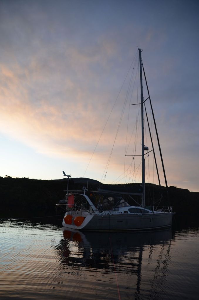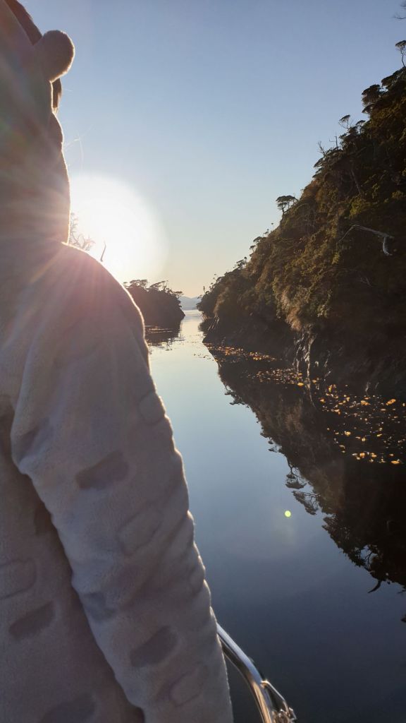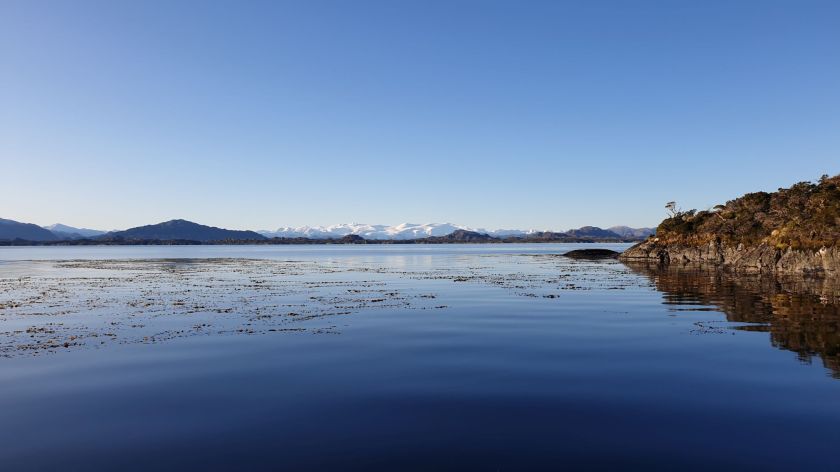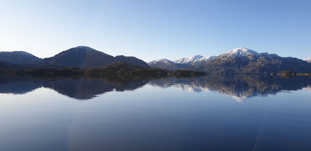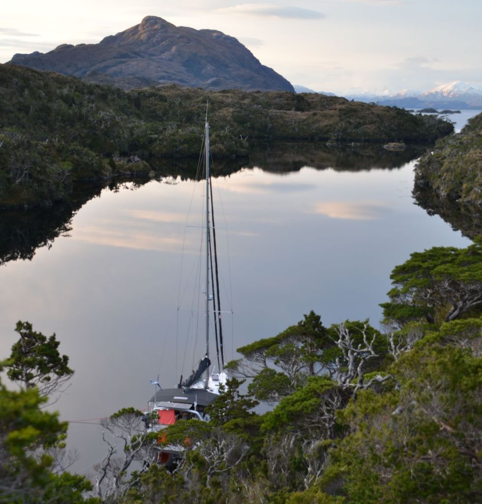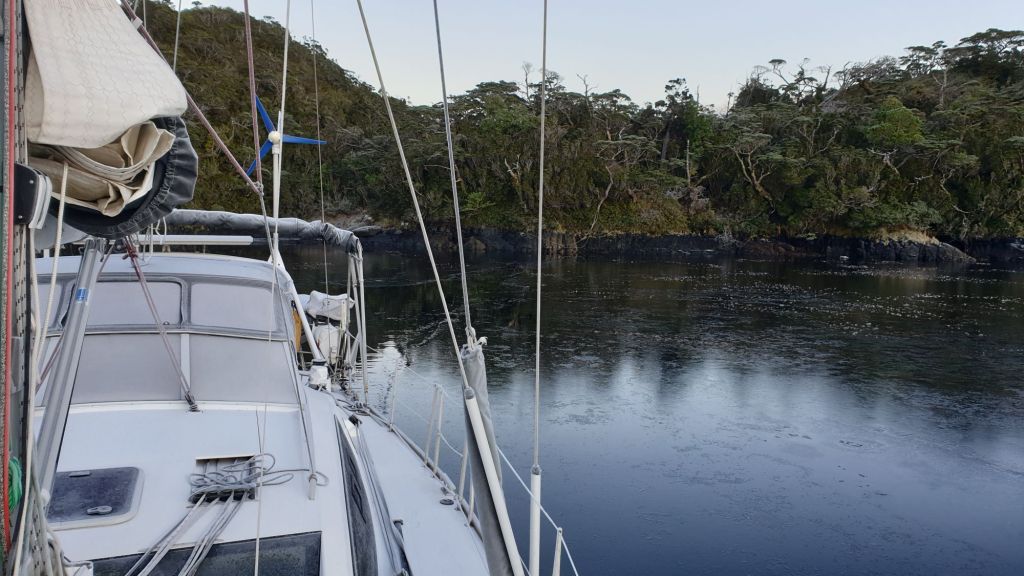 Nach einer unspektakulären Leichtwind-Querung des westlichen Endes der Magellanstraße erreichten wir das Südende des Canal Smyth. Nur La Skipper kämpfte leider mit eine kleinen Migräne. Die Kinder nutzten die indisponierte Lehrerkraft natürlich schamlos aus… der Spielecomputer lief zu Ihrer großen Freude die glücklicher Weise nicht allzulange Überfahrt im Dauerbetrieb. Selbst der morgendliche Regen ließ im Laufe des Tages nach und die Wolkendecke brach auf. Tatsächlich schien sich nun wirklich mal ein stabiles Winterhoch einzustellen. Die Vorhersage versprach sonnig-kalte Tage bei über 1020mbar.