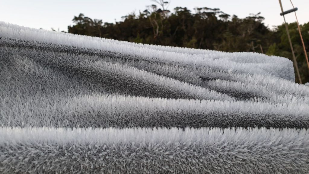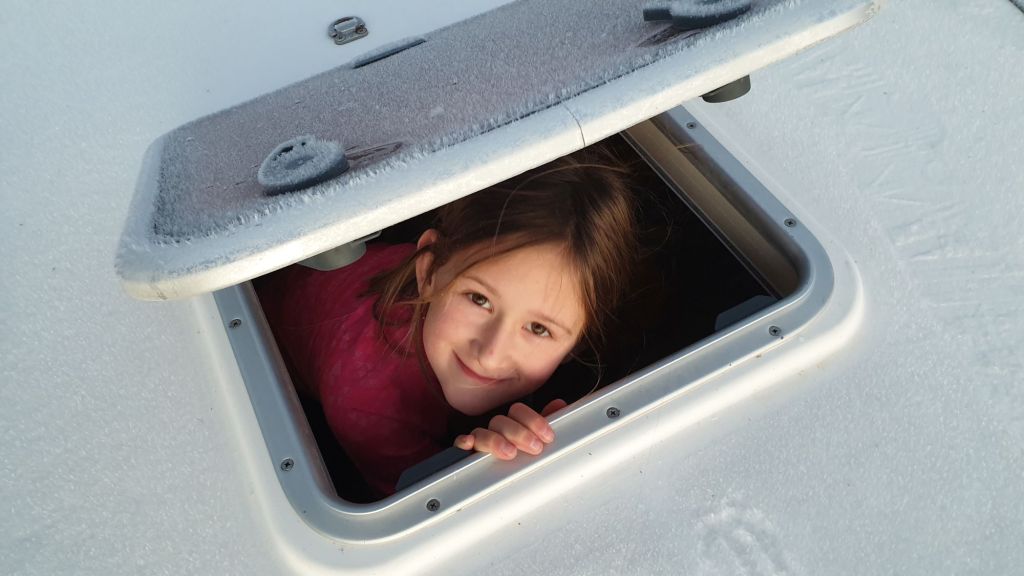 Der auch nachts klare Himmel hatte jedoch auch einen klaren Nachteil… es war noch kälter als ohnehin schon. Morgens zeigte das Thermometer lediglich 7°C unter Deck, das Kondenswasser an den Scheiben war teilweise gefroren (… von innen natürlich!) und auf dem morgendlich ruhigen Wasser zeigte sich bei Sonnenaufgang mal wieder leichte Eisbildung.