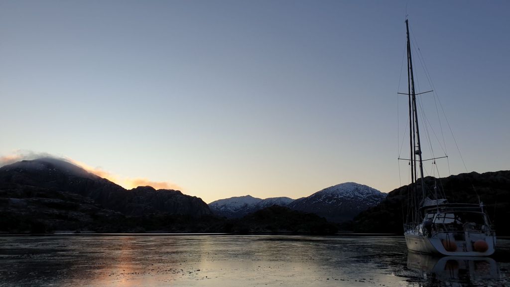 Am Ziel angekommen waren wir dann nicht sehr verwundert, hinter einer etwas weniger engen Einfahrt mal wieder von einer teilweise zugefrorenen Bucht empfangen zu werden. Natürlich war die Seite mit den empfohlenen Liegeplätzen betroffen, aber das Eis war nicht sonderlich dick. Bei der Erkundungstour brachen wir uns einen Kanal, die Crew machte sich mit Dinghy und Leinen auf zum Ufer, während der Skipper etwas weiter draußen den Anker fallen ließ. Die Fernbedienung für die elektrische Ankerwinsch war wirklich eine gute Investition.