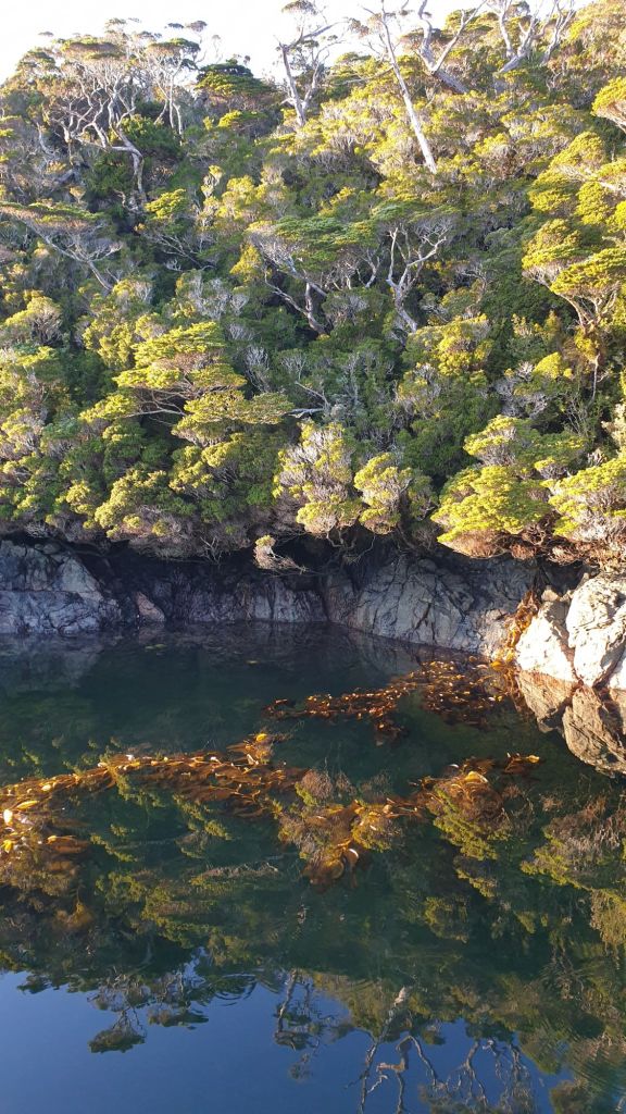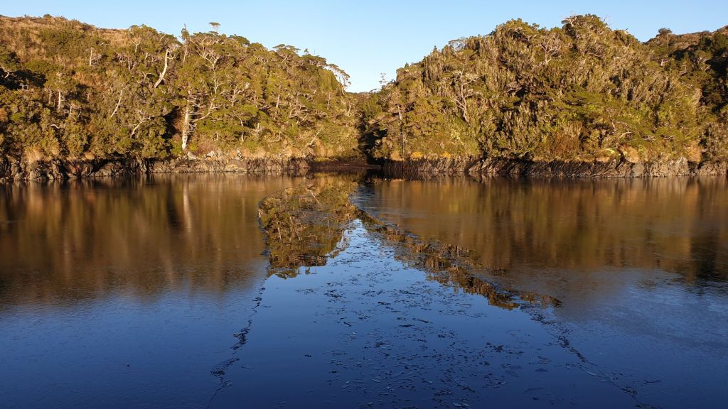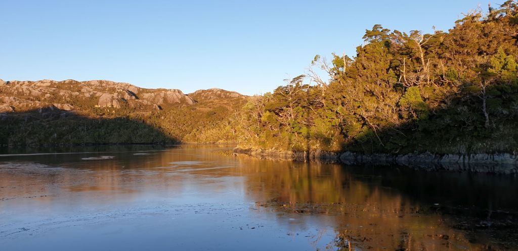 Während die Damen an Bord den von der Motorfahrt gut mit warmen Wasser gefüllten Boiler bei ihrer ersten Dusche seit Ushuaia leerten, zog es die ungewaschenen Herren an Land. Samuel sammelte schon mal trockenes Holz für das nächste Lagerfeuer, der Skipper kämpfte sich durch das Unterholz den kleinen Hang hoch, wanderte etwas im sumpfigen Gras umher und genoss schließlich den grandiosen Ausblick von einer kleinen Erhöhung.