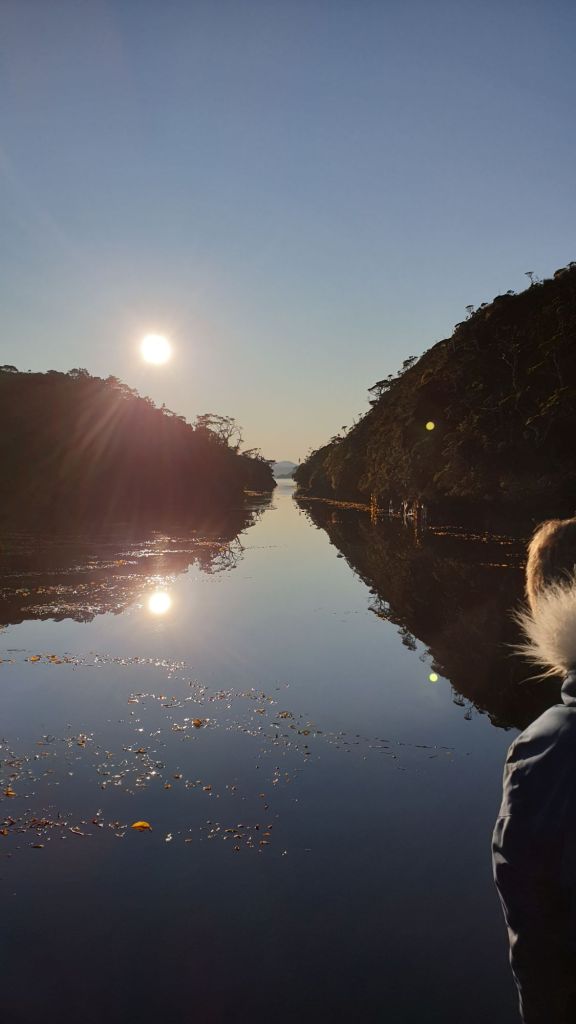 Und so knirschten wir uns der tief stehenden Sonne entgegen Richtung Ausfahrt. Sie war immer noch eng und auch die am Vortag bewährte Kelp-Wache am Bug leistete erneut hervorragende Arbeit.