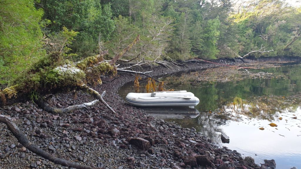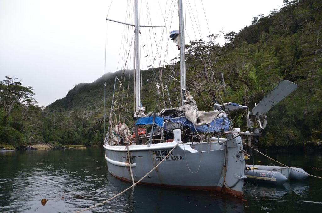 Wie bitte? Ein anderes Segelboot? Tatsächlich die erste Begegnung dieser Art seit über einem Monat. Da lag sie nun die amerikanische „Faraway“. Ein hölzerner Zweimaster, der seine besten Zeiten offensichtlich schon hinter sich hatte. John und Rusty waren mit ihr vor über 80 Tagen aus dem in Luftlinie nur 130sm entfernten Puerto Natales aufgebrochen, doch ihr Törn verlief ganz anders als geplant. In dieser Bucht lagen sie nun schon eine geschlagene Woche mit kaputtem Motor. Irgendein Problem mit dem Injektor, das dann bei notwendigem Druckablass auch noch für den Verlust von Diesel sorgte. Inzwischen waren Tank und Kanister leer und mit ihrem Garmin InReach hatte auch noch die Verbindung zur Außenwelt die Segel gestrichen. Gerne schickte ich für sie eine Satelliten-Mail ab, in der sie ihre avisierte Schlepphilfe bestätigten. Unterstützung war also unterwegs. Wir verabschiedeten uns mit eine Spende der dringend benötigten Streichhölzer und einem Nachtisch…