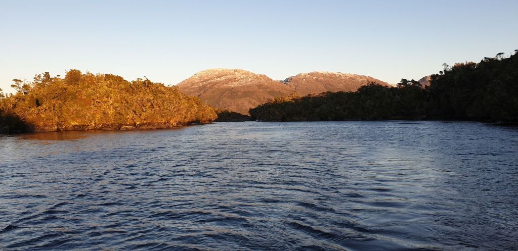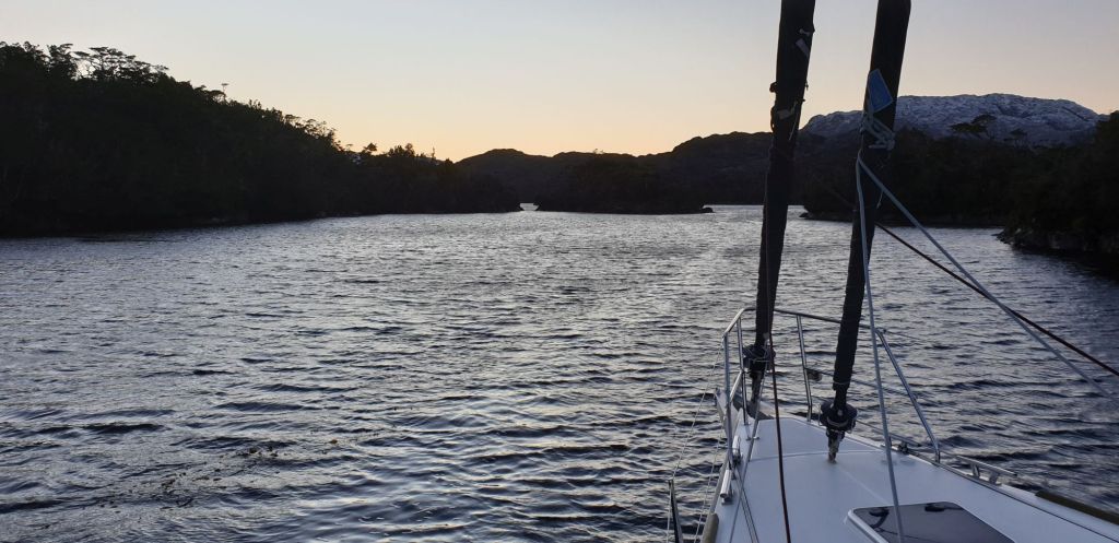 Wie bitte? Ein anderes Segelboot? Tatsächlich die erste Begegnung dieser Art seit über einem Monat. Da lag sie nun die amerikanische „Faraway“. Ein hölzerner Zweimaster, der seine besten Zeiten offensichtlich schon hinter sich hatte. John und Rusty waren mit ihr vor über 80 Tagen aus dem in Luftlinie nur 130sm entfernten Puerto Natales aufgebrochen, doch ihr Törn verlief ganz anders als geplant. In dieser Bucht lagen sie nun schon eine geschlagene Woche mit kaputtem Motor. Irgendein Problem mit dem Injektor, das dann bei notwendigem Druckablass auch noch für den Verlust von Diesel sorgte. Inzwischen waren Tank und Kanister leer und mit ihrem Garmin InReach hatte auch noch die Verbindung zur Außenwelt die Segel gestrichen. Gerne schickte ich für sie eine Satelliten-Mail ab, in der sie ihre avisierte Schlepphilfe bestätigten. Unterstützung war also unterwegs. Wir verabschiedeten uns mit eine Spende der dringend benötigten Streichhölzer und einem Nachtisch…