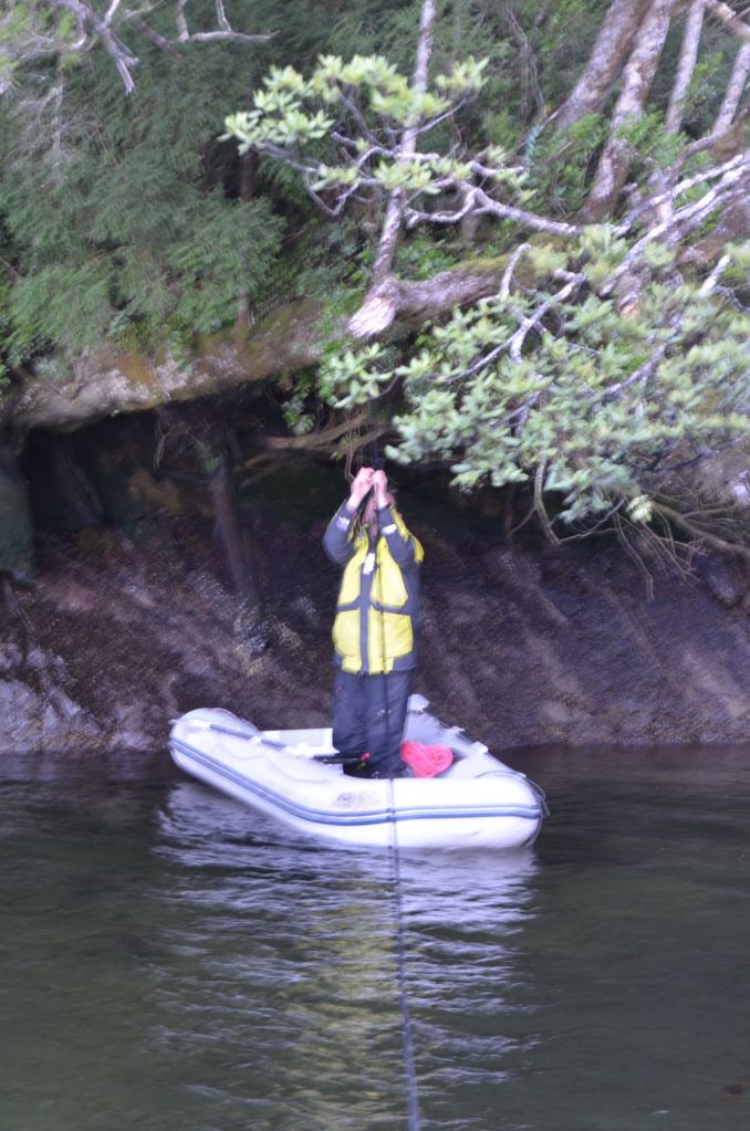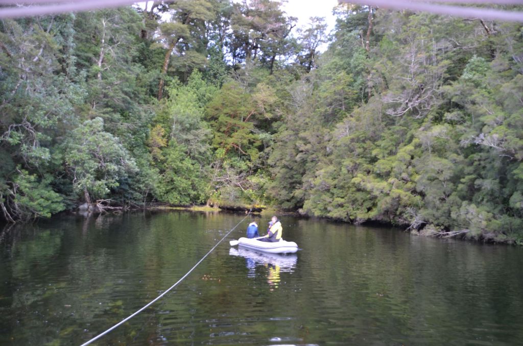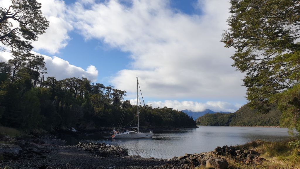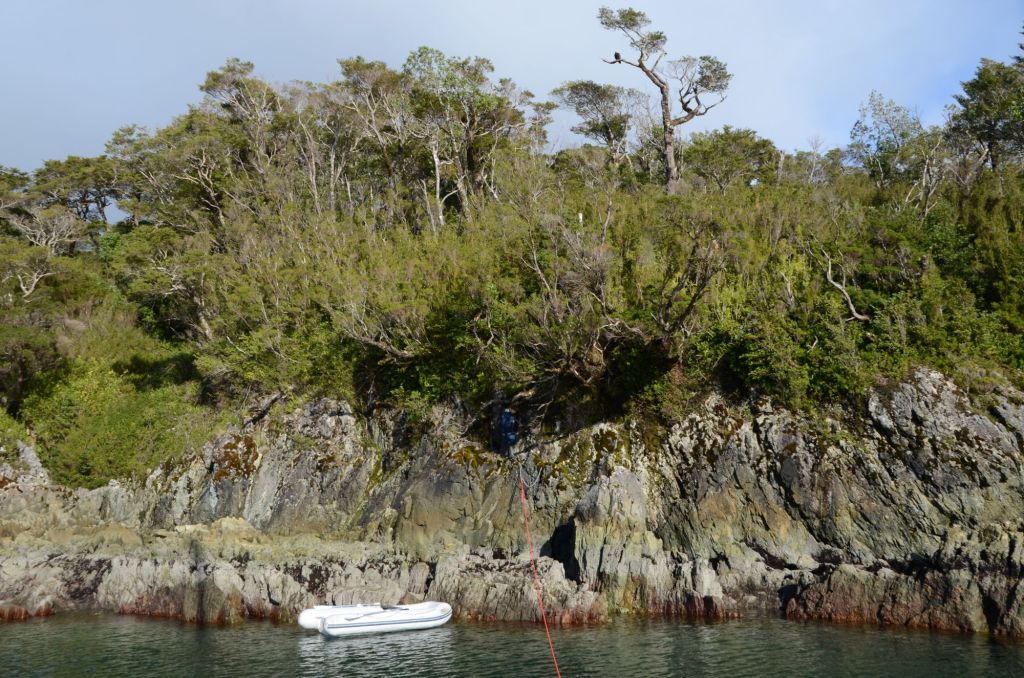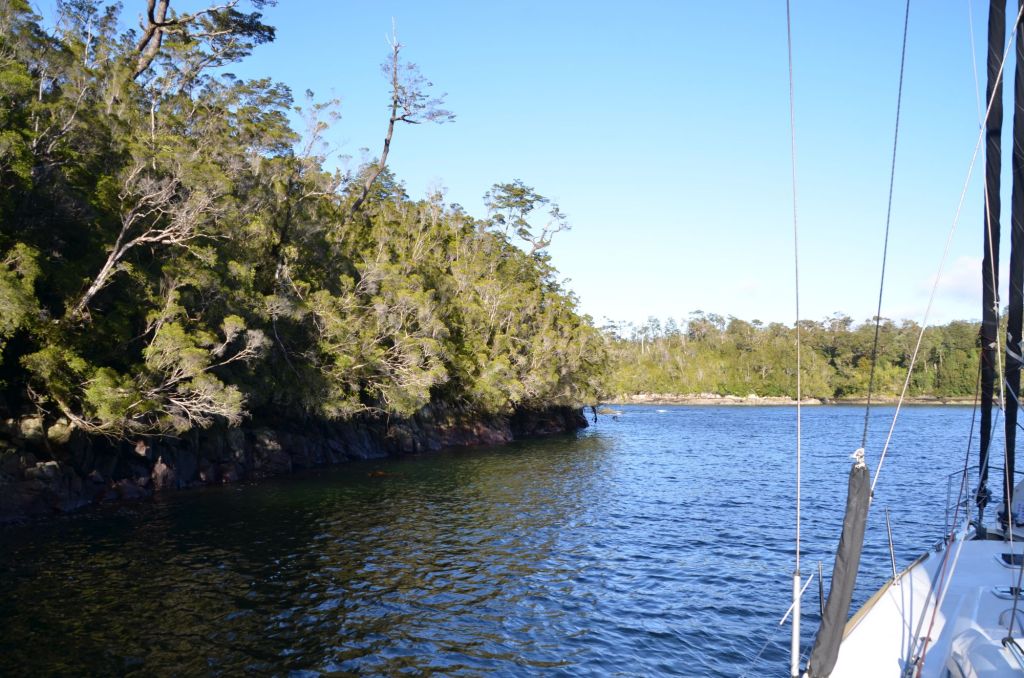 Am nächsten Tag erkundeten der Skipper und Maila mit dem Dinghy die kleinere, gleich südlich gelegene Caleta Karina. Es waren wieder 30er Böen angesagt und die nächtlich Mischung aus schabender Ankerkette und Fehlalarmen nervte doch sehr. Die nächsten, teils wieder sehr böig-nass angesagten Tage und Nächte wollten wir in besserer Abdeckung verbringen. Eine gute Entscheidung! Mit vier Landleinen lagen wir gut von Bäumen geschützt deutlich ruhiger und entspannter. Nur wenige, eher schwache Böen erreichten uns während gleich vor der Einfahrt im Kanal das Wasser weiß rauschte.