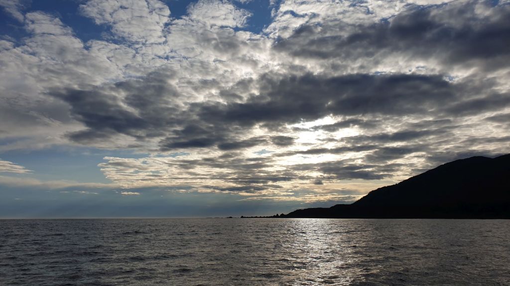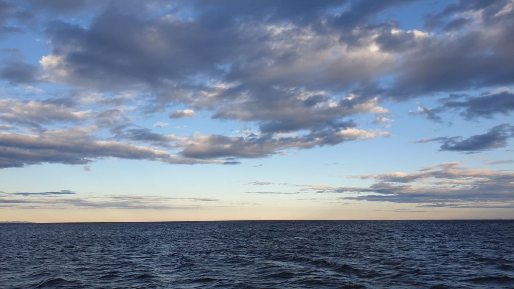 Doch das war eben diesem Wind wohl nicht so richtig bewusst. Es blies weiter mit konstant 6 Bft. und 7’er Böen von vorne. Wenigsten nahm die Welle wie erwartet etwas ab. Trotzdem schafften wir kaum die notwendigen 4kn Fahrt über Grund. Das nächste Problem war schließlich der winterlich frühe Sonnenuntergang gegen halb sechs. Spätestens um 18 Uhr sollten wir am Ziel sein, ansonsten würden wir im Dunkeln tappen. Als wir um halb vier die erste Fischfarm dieser Reise passierten, lagen noch knapp 10sm vor uns.
