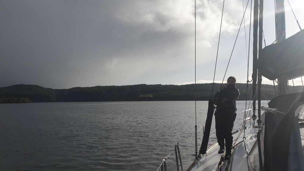 Der nächste Tag war ein Paradebeispiel für „wechselhaftes“ Wetter. Immer wieder zogen Zellen mit Regen, Graupel und kräftigem Wind durch. Jedes Mal holten wir die Fock raus und fast jedes Mal hing sie wenig später wieder schlaff am Vorstag. Nur einmal lohnte es sich für eine Stunde den Motor auszuschalten und das Segelboot seiner eigentlichen Bestimmung zuzuführen. Den Abschluss dieses schönen Intermezzo bildete ein ebensolcher Regenbogen.