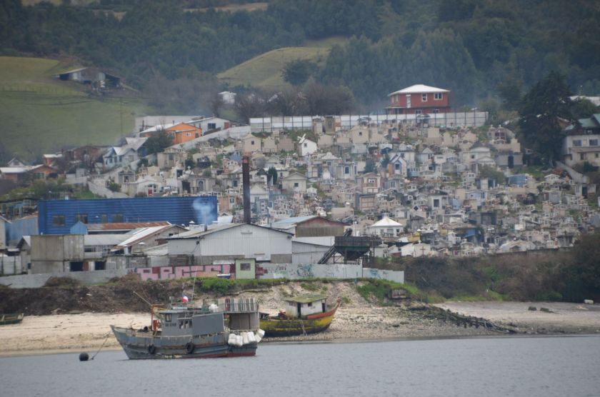 Mitten im Ort selbst ragt eine der 17 zum Weltkulturerbe Chiloés gehörenden Holzkirchen heraus, nicht weit entfernt bildet der Friedhof eine Landmarke mit Wiedererkennungspotenzial. Insgesamt präsentiert sich ein uns fast schon fremd gewordenes Treiben.