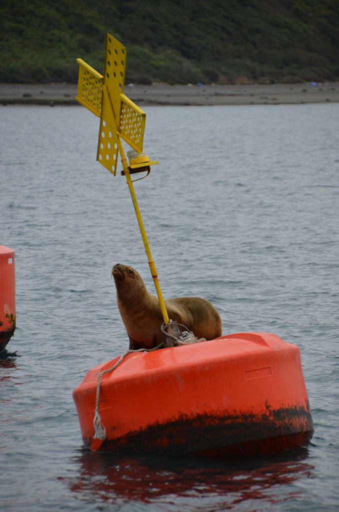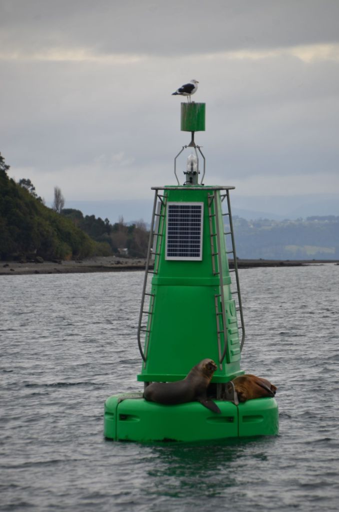 Zwischen Caleta Rilán und dem nächsten Zwischenstopp liegt quer die Isla Quinchao. Mit anderen Worten bleibt die Wahl zwischen einem Umweg rechts oder links herum. Wir entscheiden uns für letzteres. Die Gezeitenströmung sollte uns schnell durch den Canal Hudson schieben und so kommen wir zumindest auch mal in Sichtweite einer chilenischen Stadt. Nun gut, ehrlich gesagt ist Dalcahue mit seinen etwas über 7.000 Einwohner wohl doch eher ein Großdorf. Trotzdem haben wir seit Ushuaia keine vergleichbare Menschenansammlung in weniger als ein paar Meilen passiert. Doch vorher passieren wir erst einmal ein paar der hier fast allgegenwärtigen Fisch-und Muschelfarmen. Und neben normalen Fahrwassertonnen sind auch gerade die Begrenzungstonnen dieser Farmen ein beliebter Ruheplatz für Seelöwen.