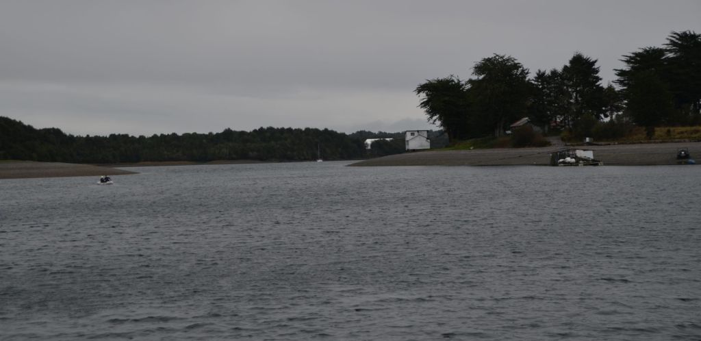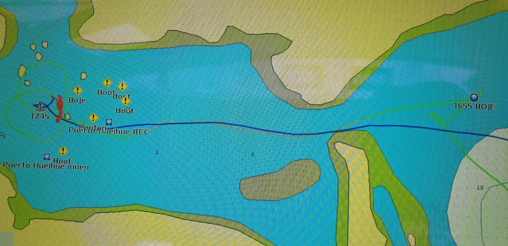 Begrüßt von einigen großen Delfine erreichen wir am Nachmittag unser Ziel. Puerto Hueihue präsentiert sich auf dem Detailplan der „blauen Bibel“ mal wieder als kleiner Leckerbissen. Die schmale Ausbuchtung mit Ihren Untiefen vor der Küste wird fast vollständig von Muschelfarmen eingenommen. Am Ende öffnet sich eine schmale, flache Durchfahrt in eine abgesehen von der Mitte ebenso flache Lagune. „There was reported the possibility to enter the inner bay from half tide.“ Keine Frage, wo der Skipper die Nacht verbringen möchte.