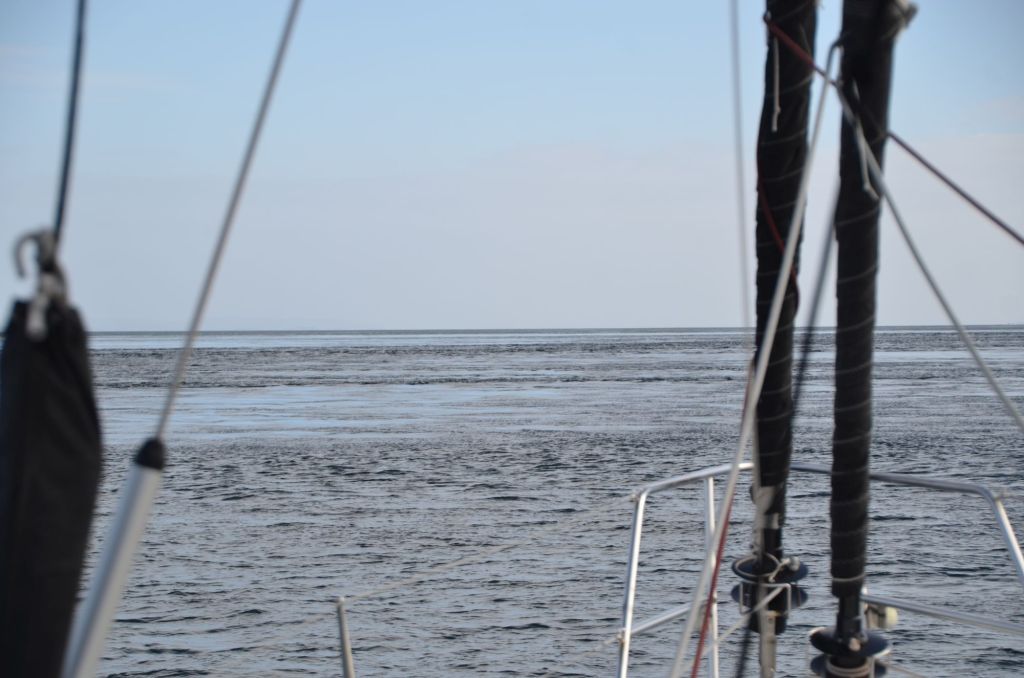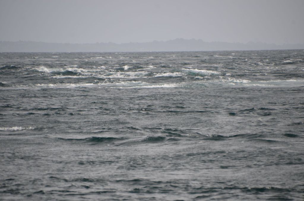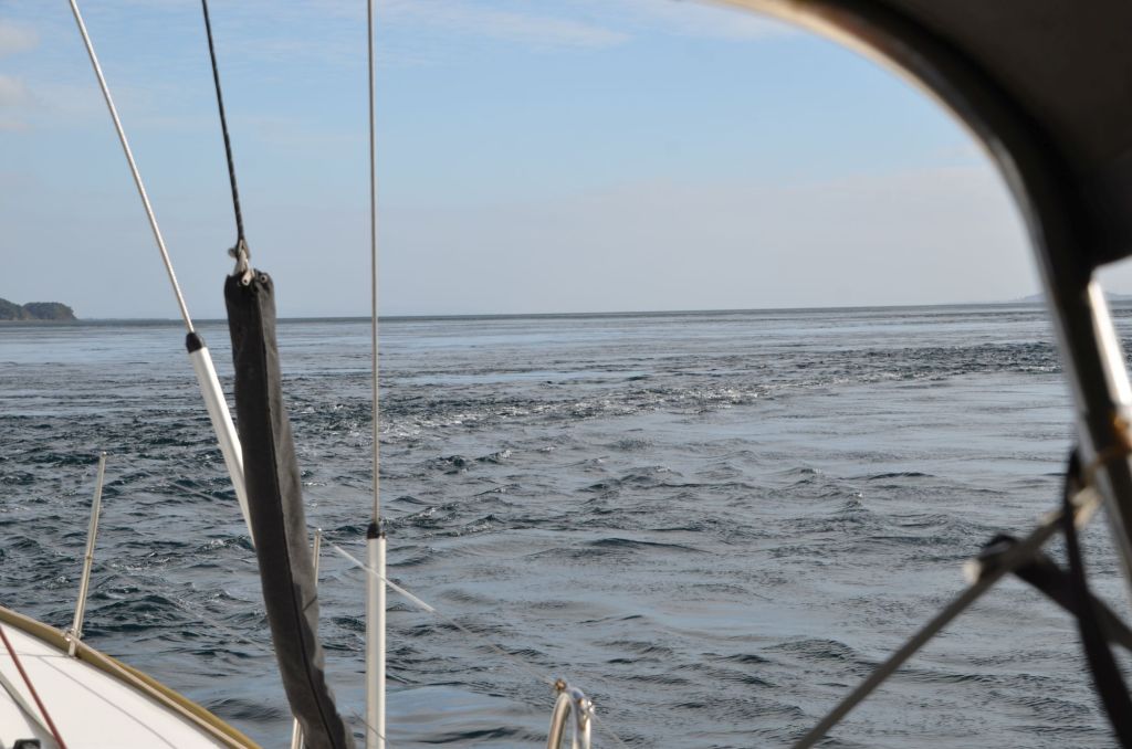 Solche Stromverwerfungen haben wir wirklich noch nicht gesehen. Ausweichen ist unmöglich. Das Ruder fest in der Hand spüre ich immer wieder, dass unsere Samai fast schon wie eine Jolle verschoben wird. In der Spitze rasen wir mit fast 12kn über Grund.